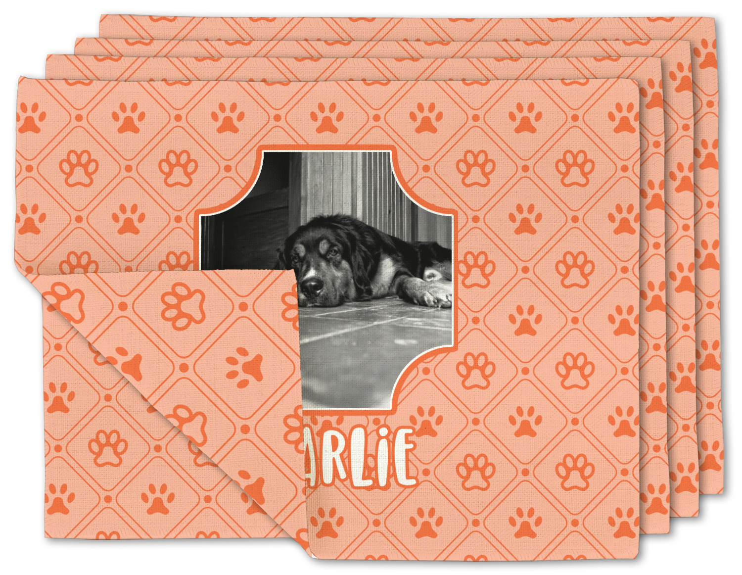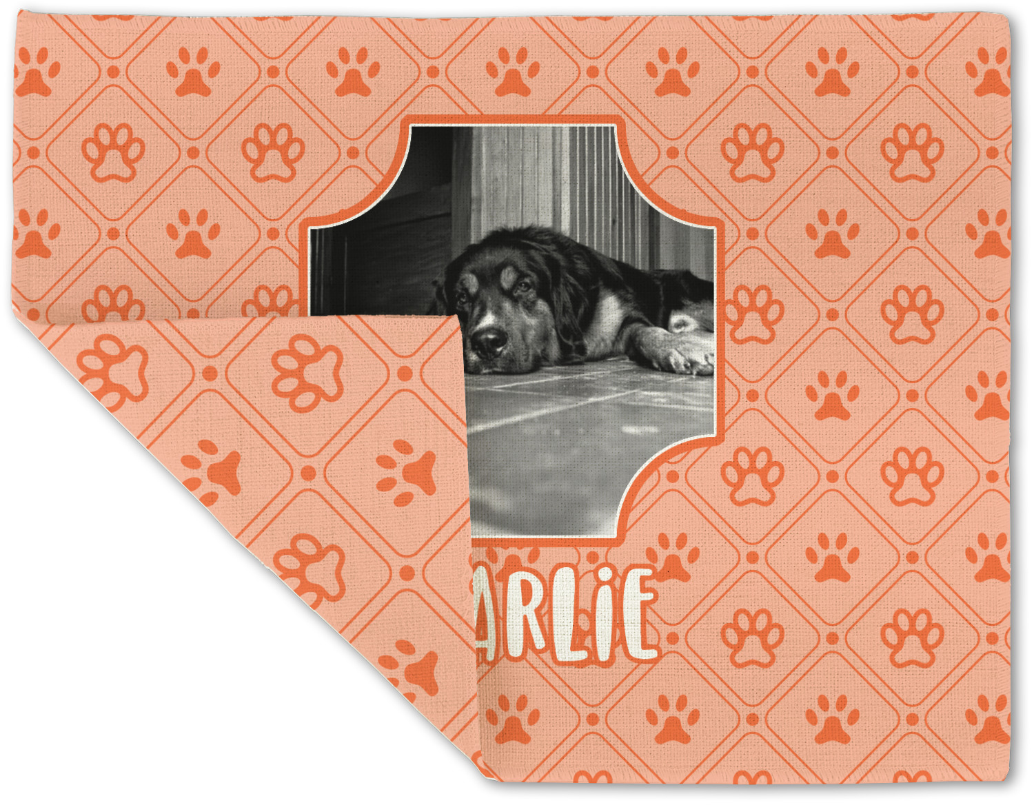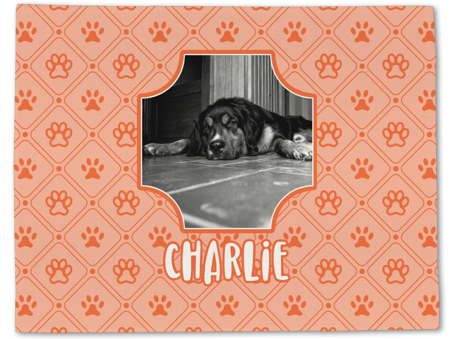 This design is a bright peach with accents of orange. In the middle, you can upload your favorite picture of your pet! It's a breeze with our design center. Underneath their picture, put their name or a fun saying. The background is filled with a fun pattern of pawprints and bones. This will be the perfect design for a sweet puppy.