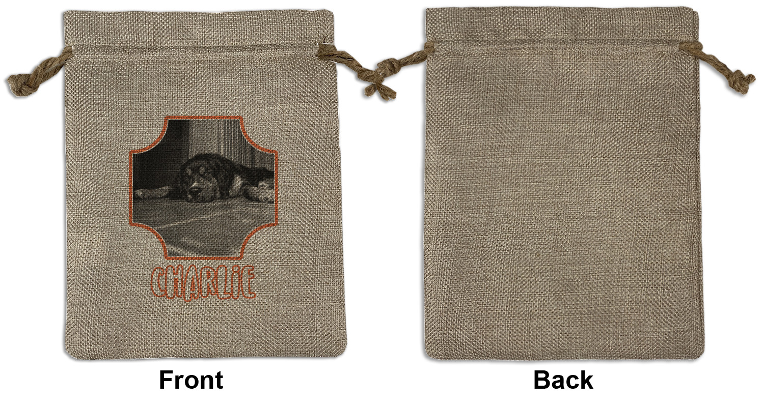 We sell our Burlap Gift Bags in 3 variant sized bags. Made with burlap polyester, each personalized bag can be secured with a twine drawstring pull. Your custom design is available to print on one side or both sides - completely up to you! The sizes of the bags measure approximately 4.5" x 6.5" for the smallest size, 6.5" x 8.0" for the medium size, and 6.5" x 13.5" for the large-sized bag.