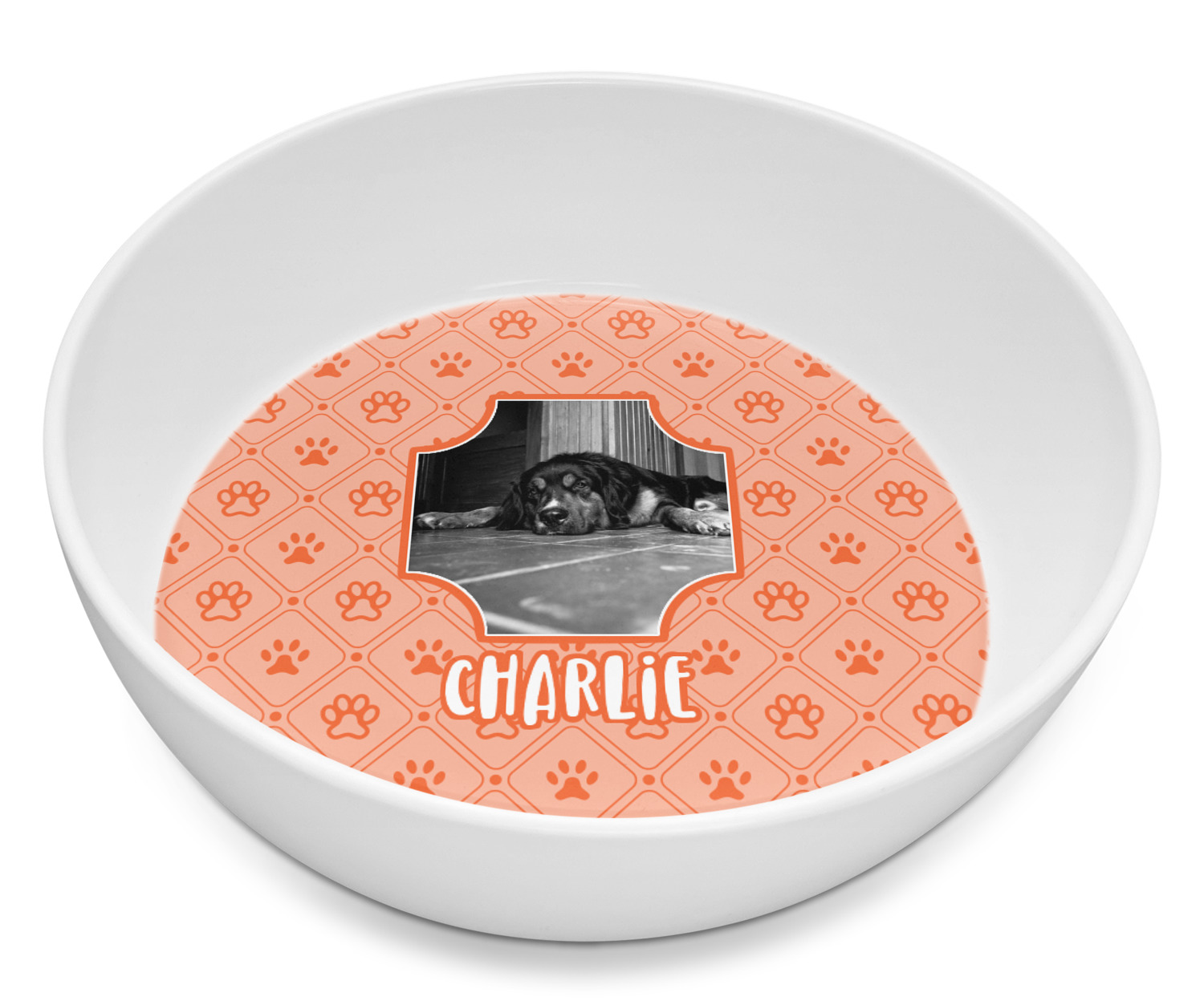 This design is a bright peach with accents of orange. In the middle, you can upload your favorite picture of your pet! It's a breeze with our design center. Underneath their picture, put their name or a fun saying. The background is filled with a fun pattern of pawprints and bones. This will be the perfect design for a sweet puppy.