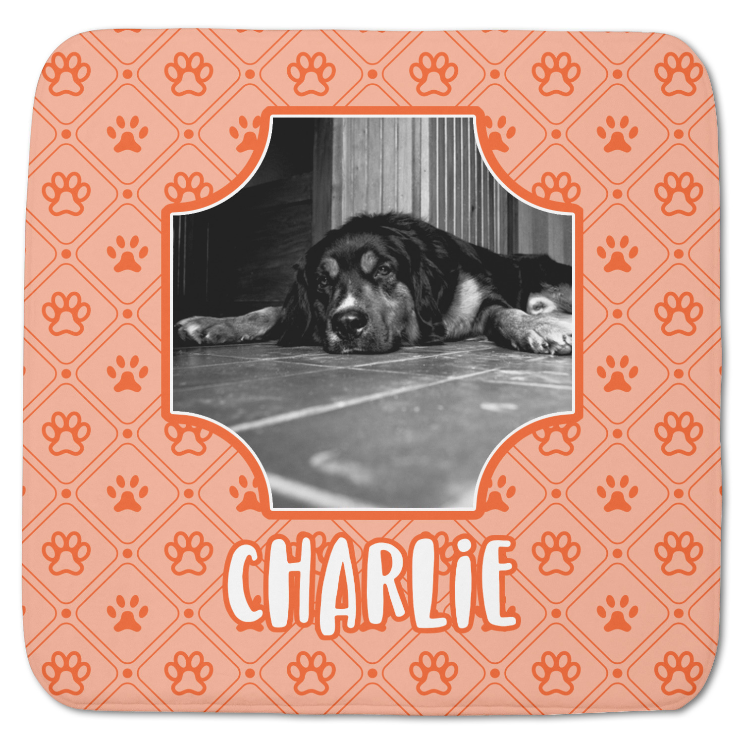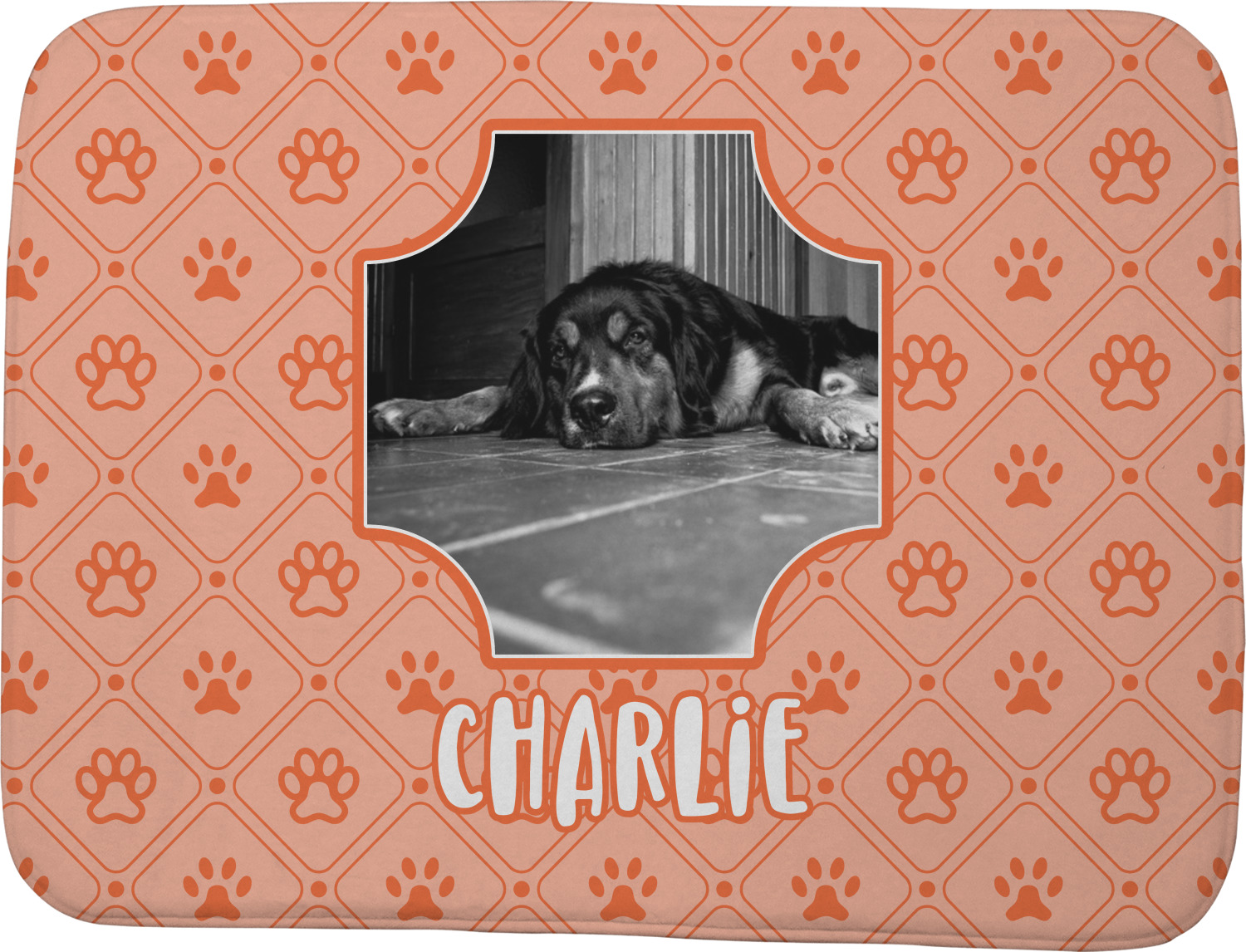 This design is a bright peach with accents of orange. In the middle, you can upload your favorite picture of your pet! It's a breeze with our design center. Underneath their picture, put their name or a fun saying. The background is filled with a fun pattern of pawprints and bones. This will be the perfect design for a sweet puppy.