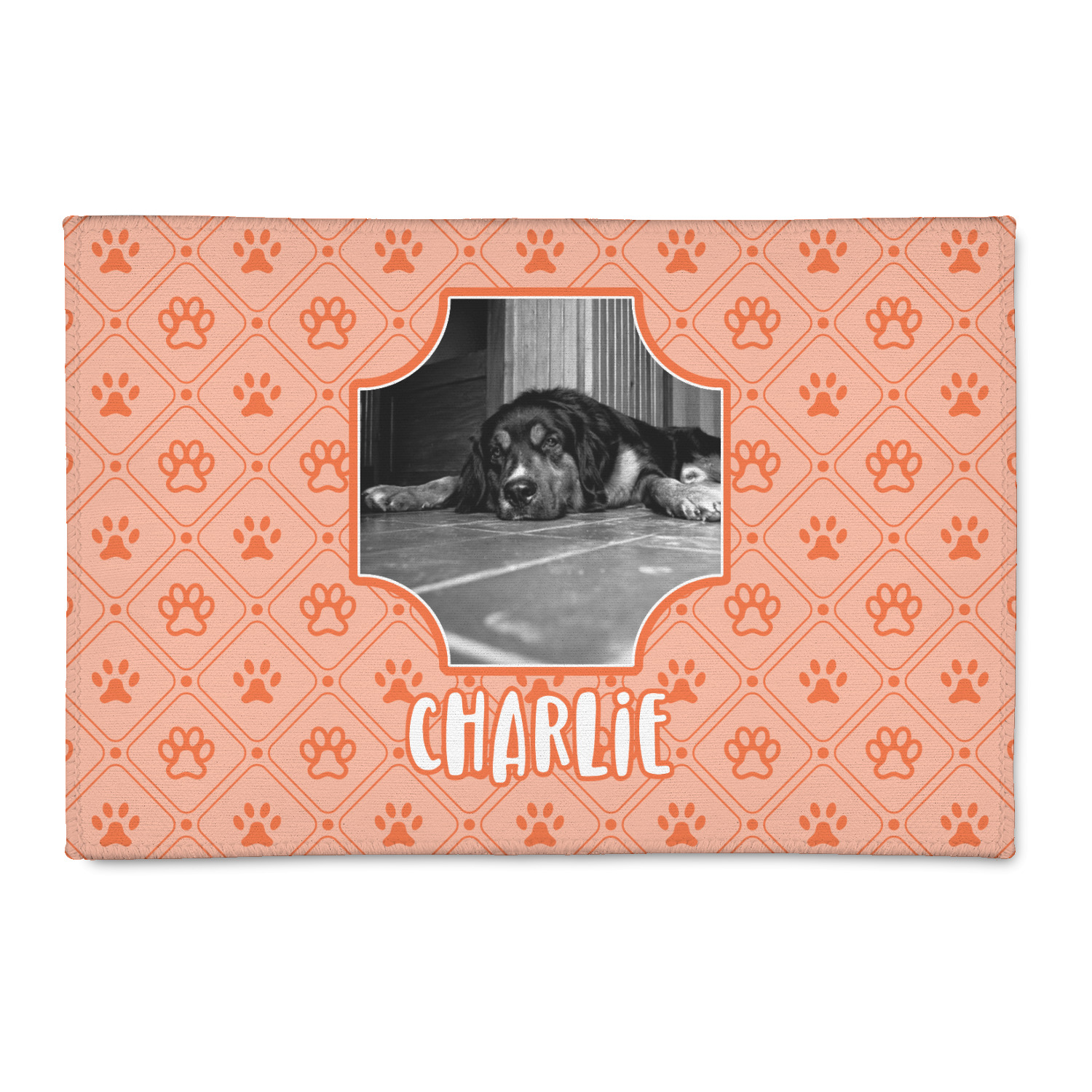 This design is a bright peach with accents of orange. In the middle, you can upload your favorite picture of your pet! It's a breeze with our design center. Underneath their picture, put their name or a fun saying. The background is filled with a fun pattern of pawprints and bones. This will be the perfect design for a sweet puppy.