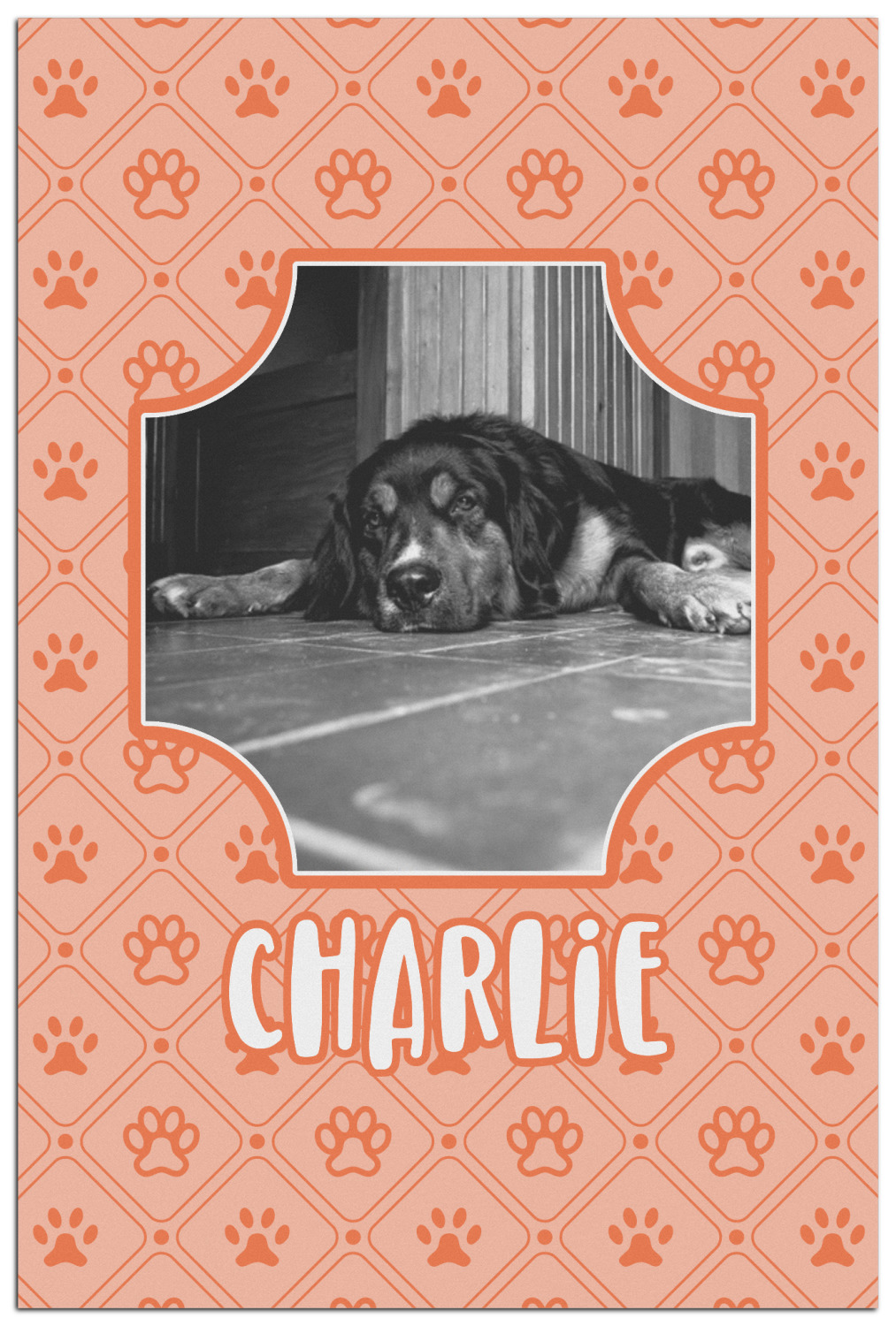 This design is a bright peach with accents of orange. In the middle, you can upload your favorite picture of your pet! It's a breeze with our design center. Underneath their picture, put their name or a fun saying. The background is filled with a fun pattern of pawprints and bones. This will be the perfect design for a sweet puppy.