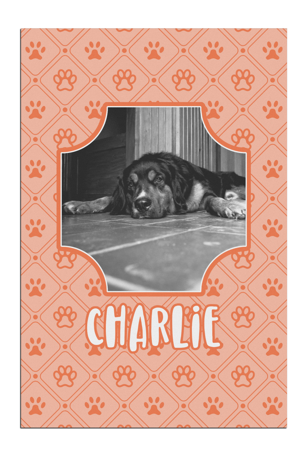 This design is a bright peach with accents of orange. In the middle, you can upload your favorite picture of your pet! It's a breeze with our design center. Underneath their picture, put their name or a fun saying. The background is filled with a fun pattern of pawprints and bones. This will be the perfect design for a sweet puppy.