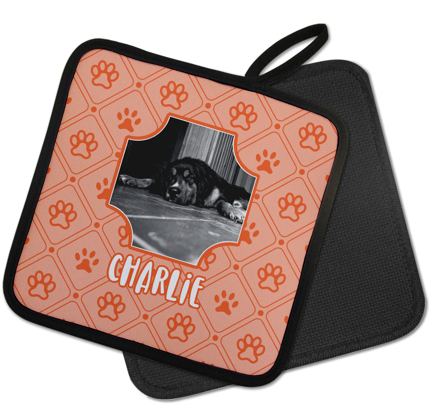 Our personalized pot holders feature a neoprene front that displays your personalization in vibrant colors. The backing of the hot pot holder is rubberized; the textured backing allows you to have a great grip when using this custom pot holder. The two materials are joined with a sleek, black trim, and the holder also includes an attached loop for hanging and storage. The pot holder is approximately 8.75 inches by 8.75 inches and 0.25 inches tall, while the fabric loop is 2.5 inches long. You can purchase a kitchen pot holder by itself or as a set of 2. We also offer a set including one pot holder and one oven mitt.
