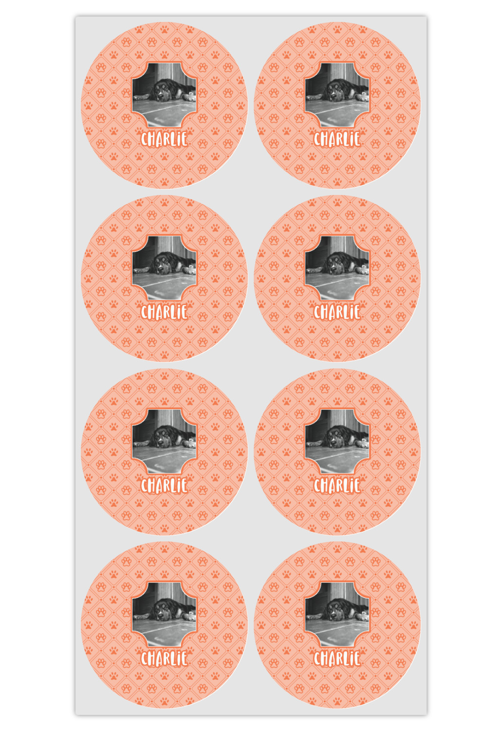 This design is a bright peach with accents of orange. In the middle, you can upload your favorite picture of your pet! It's a breeze with our design center. Underneath their picture, put their name or a fun saying. The background is filled with a fun pattern of pawprints and bones. This will be the perfect design for a sweet puppy.