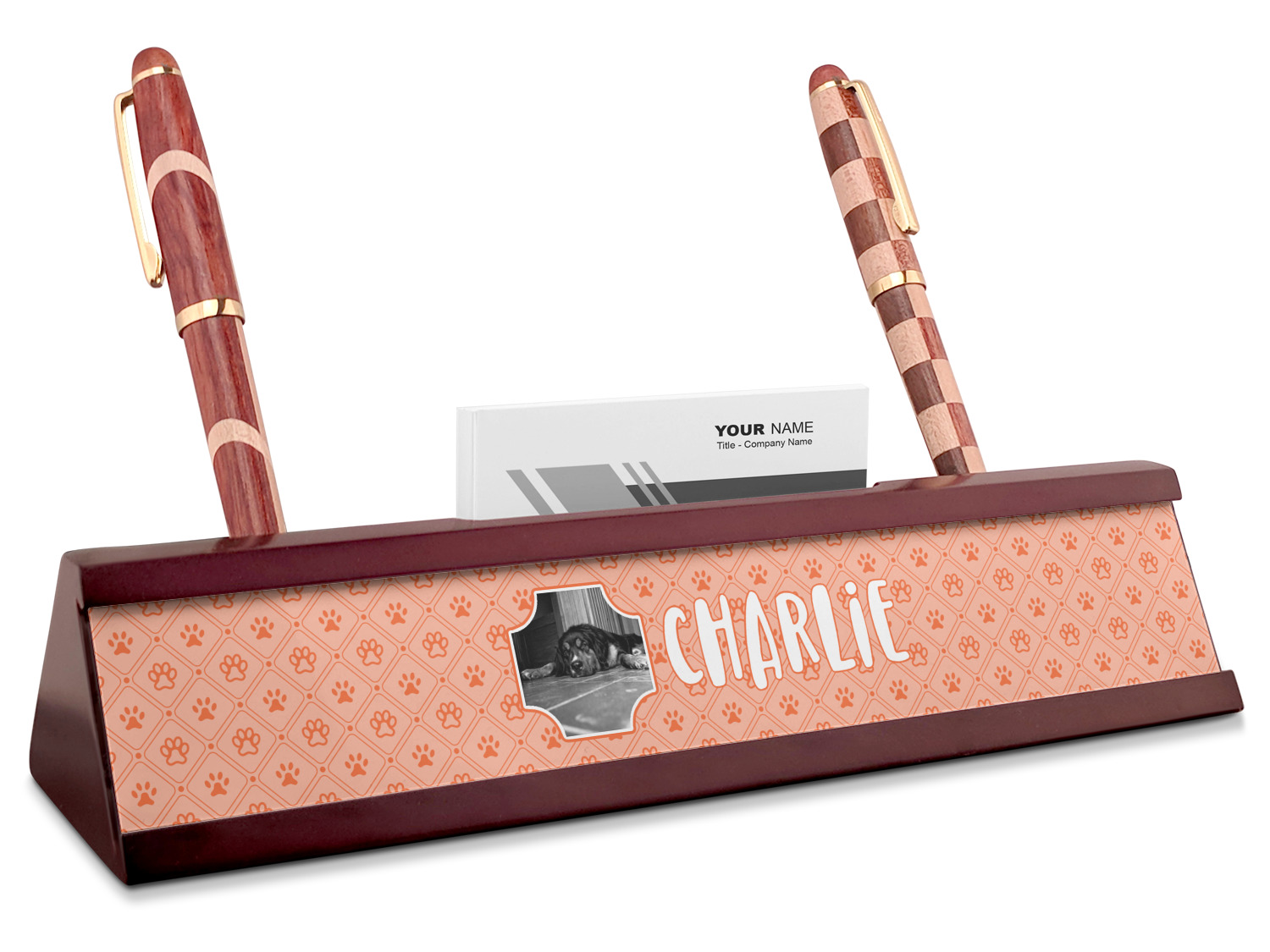 Your desk name plates are crafted from a high-quality, dark-cherry mahogany. At approximately 9.5 by 1.875 by 2.5 inches, this name plaque will fit perfectly, front and center, on your desk. Your customization spans across the entire face of the nameplate. Behind the nameplate lies a skinny slot that can fit approximately 15, traditionally-sized, business cards. You can also store your writing utensils on either side of this custom desk name plate.