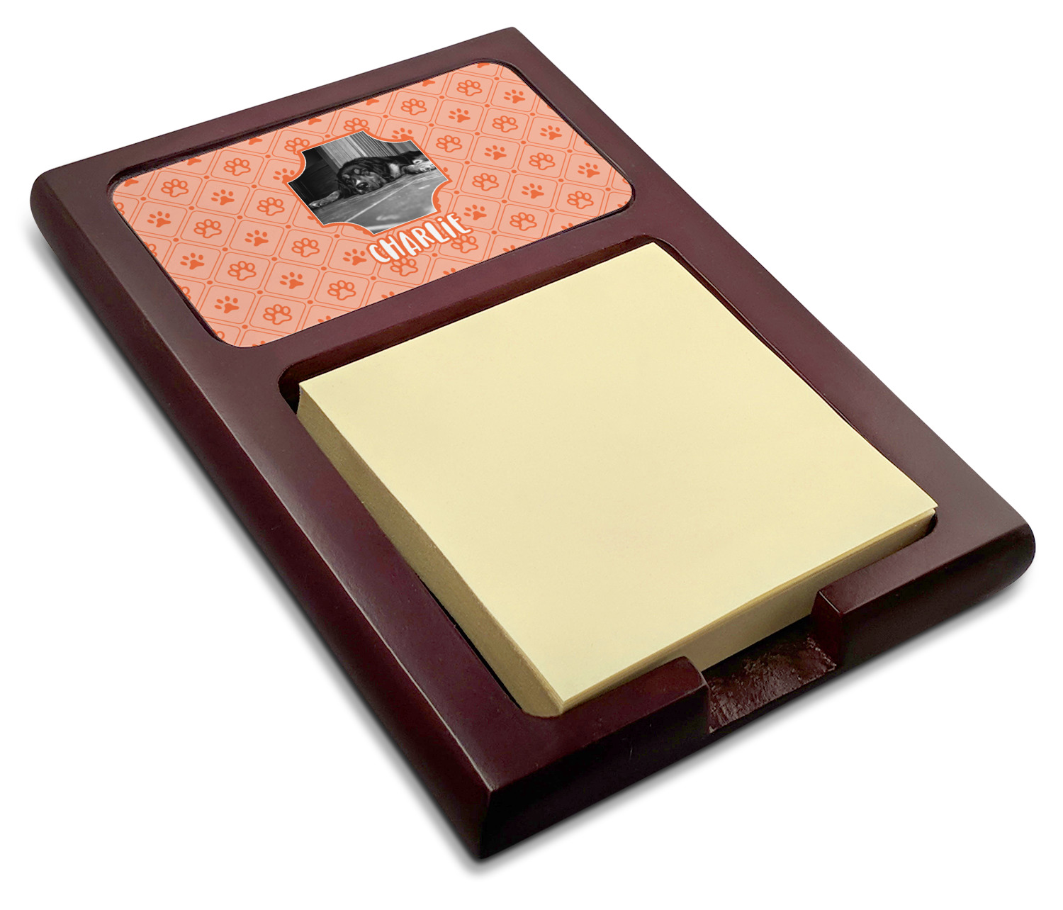 Crafted from a fine mahogany, this post it note holder is in the shade of a dark, cherry color. The dispenser itself is about 4.25 by 6.25 by 0.75 inches. You can place your 3 by 3 inch sticky notes in the indentation below the nameplate. We print your customization onto the nameplate that rests above the velvety indentation.