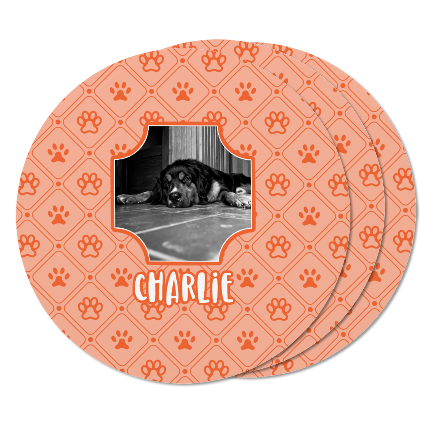 This design is a bright peach with accents of orange. In the middle, you can upload your favorite picture of your pet! It's a breeze with our design center. Underneath their picture, put their name or a fun saying. The background is filled with a fun pattern of pawprints and bones. This will be the perfect design for a sweet puppy.