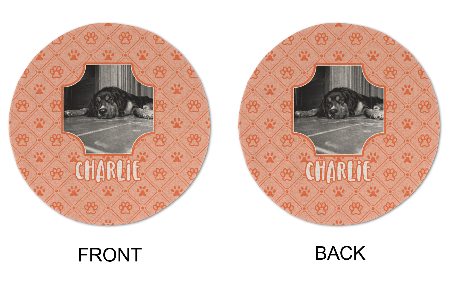 This design is a bright peach with accents of orange. In the middle, you can upload your favorite picture of your pet! It's a breeze with our design center. Underneath their picture, put their name or a fun saying. The background is filled with a fun pattern of pawprints and bones. This will be the perfect design for a sweet puppy.