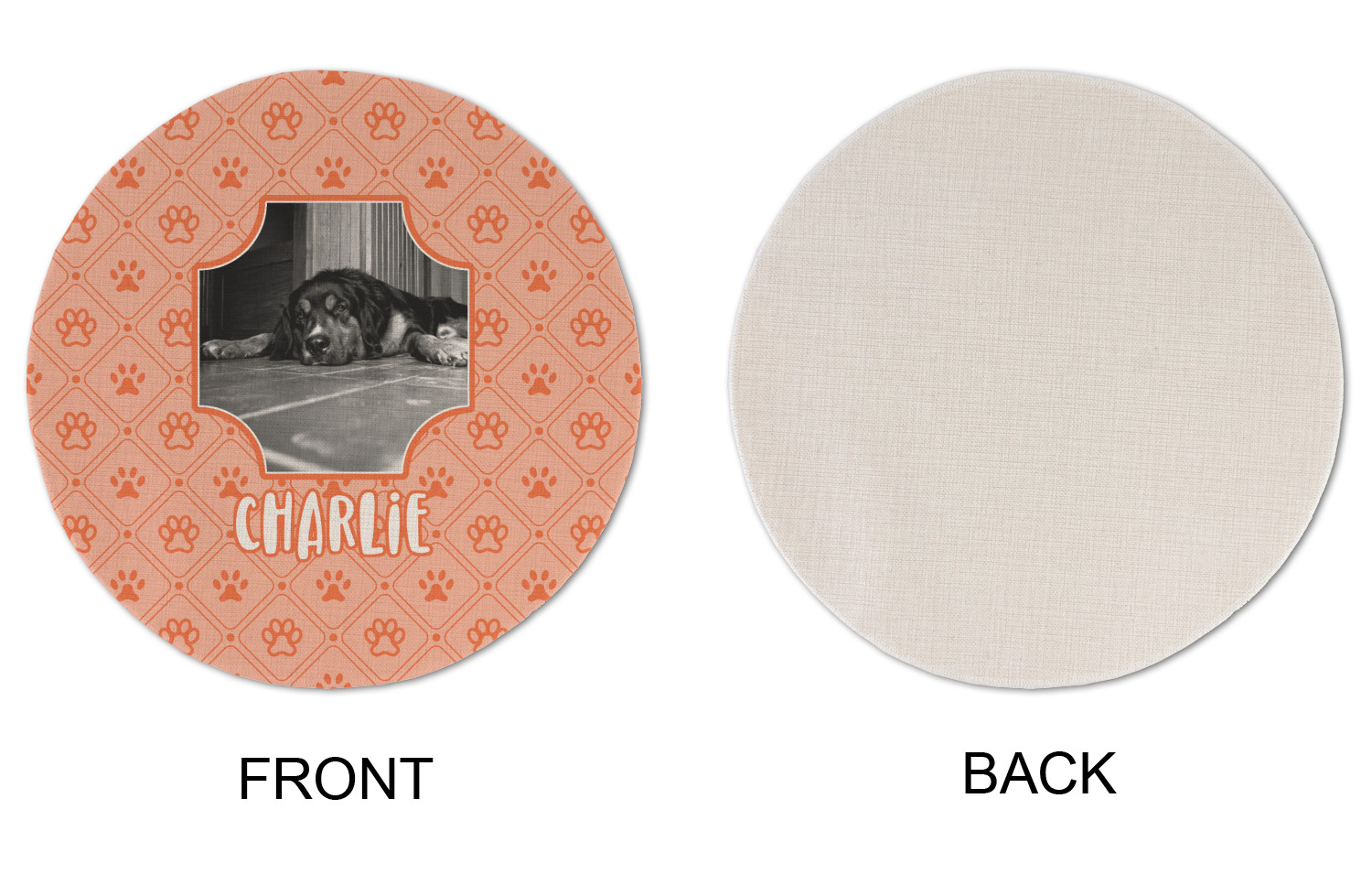 This design is a bright peach with accents of orange. In the middle, you can upload your favorite picture of your pet! It's a breeze with our design center. Underneath their picture, put their name or a fun saying. The background is filled with a fun pattern of pawprints and bones. This will be the perfect design for a sweet puppy.