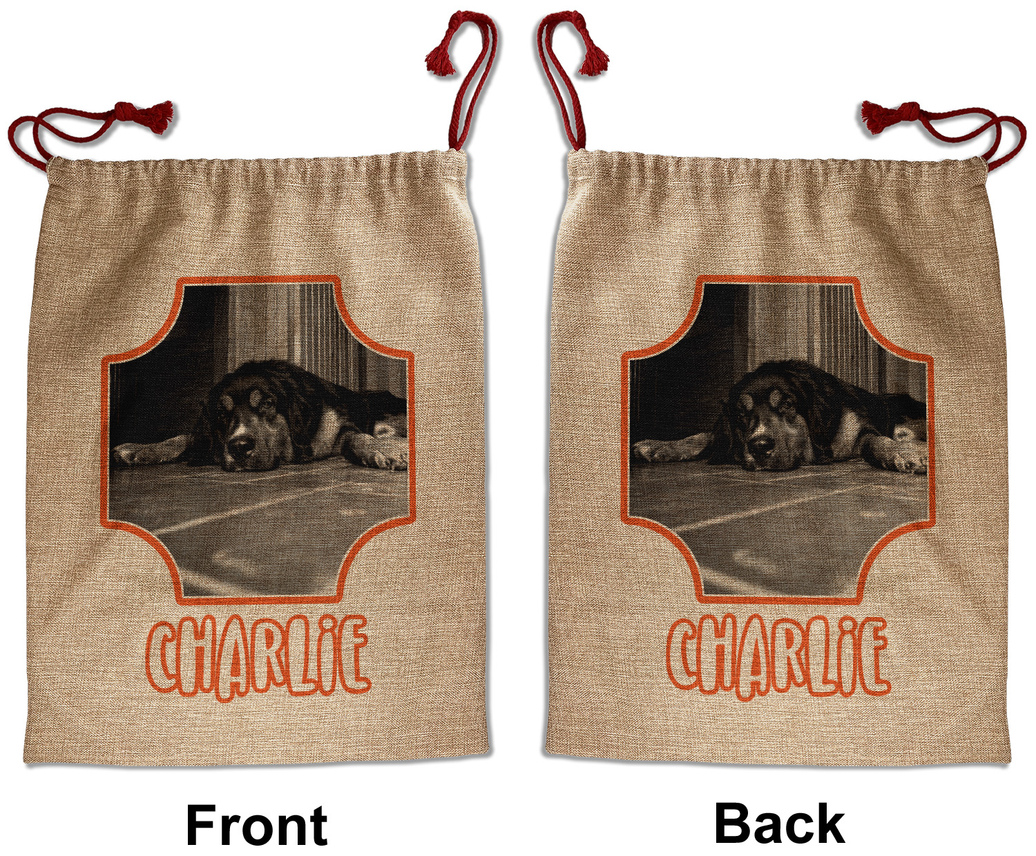 Our Santa sacks print your design on the burlap material giving it a nice rustic, natural design! The burlap material is also machine washable and wrinkle-free, so feel free to fold and store out Santa bags until the next time you need it! Secure your gifts with our red accent drawstring ties at the top of the sack so the mystery of your gift stays a surprise until Christmas day. We offer two types of printing- one side partial print or double-sided partial printing. Design and personalize your own Santa sack in time for the holidays!