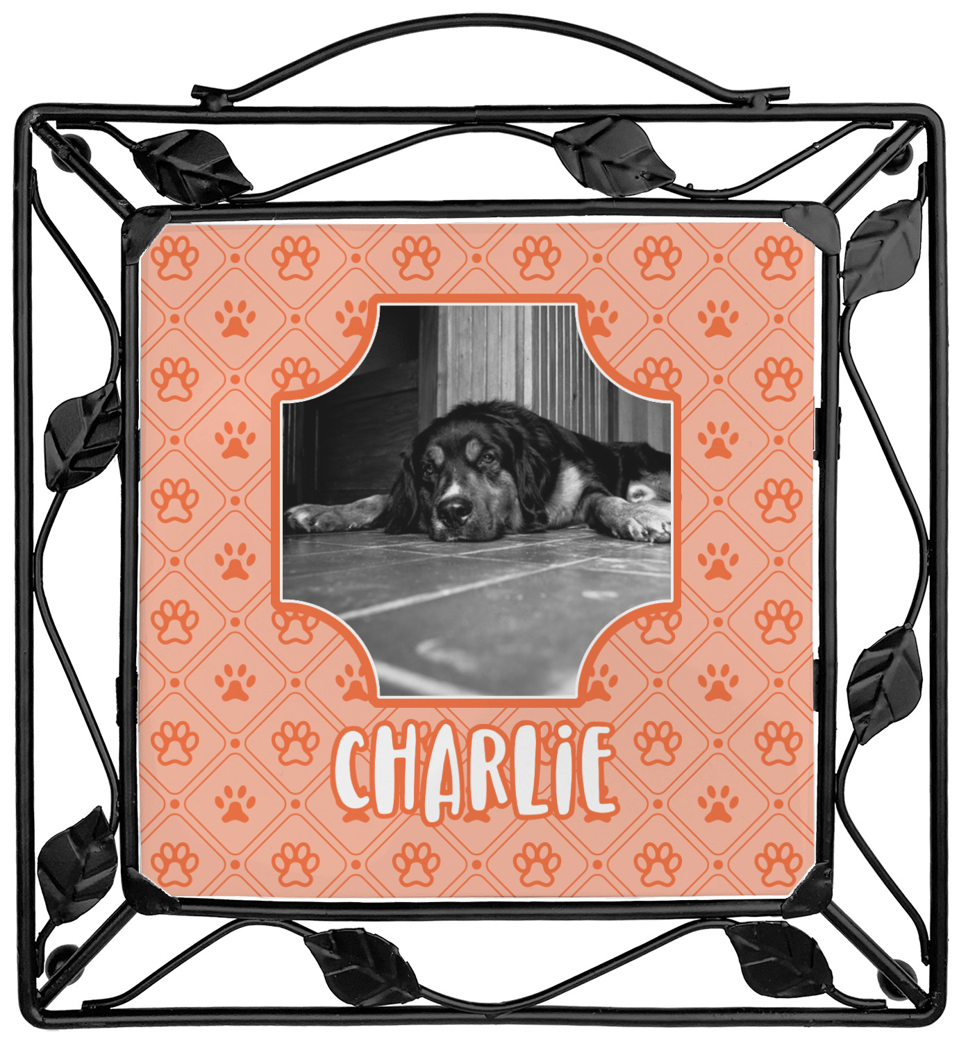 Our square trivets are made from a durable, wrought iron. This model features 4 small half circles, one on each corner, and a larger ring of iron that circles the central, customized tile. Each of the 4 corners has a round foot on its bottom for stability. This trivet is 8.75 by 8.75 inches, but the central tile measures at 6 inches on both sides.