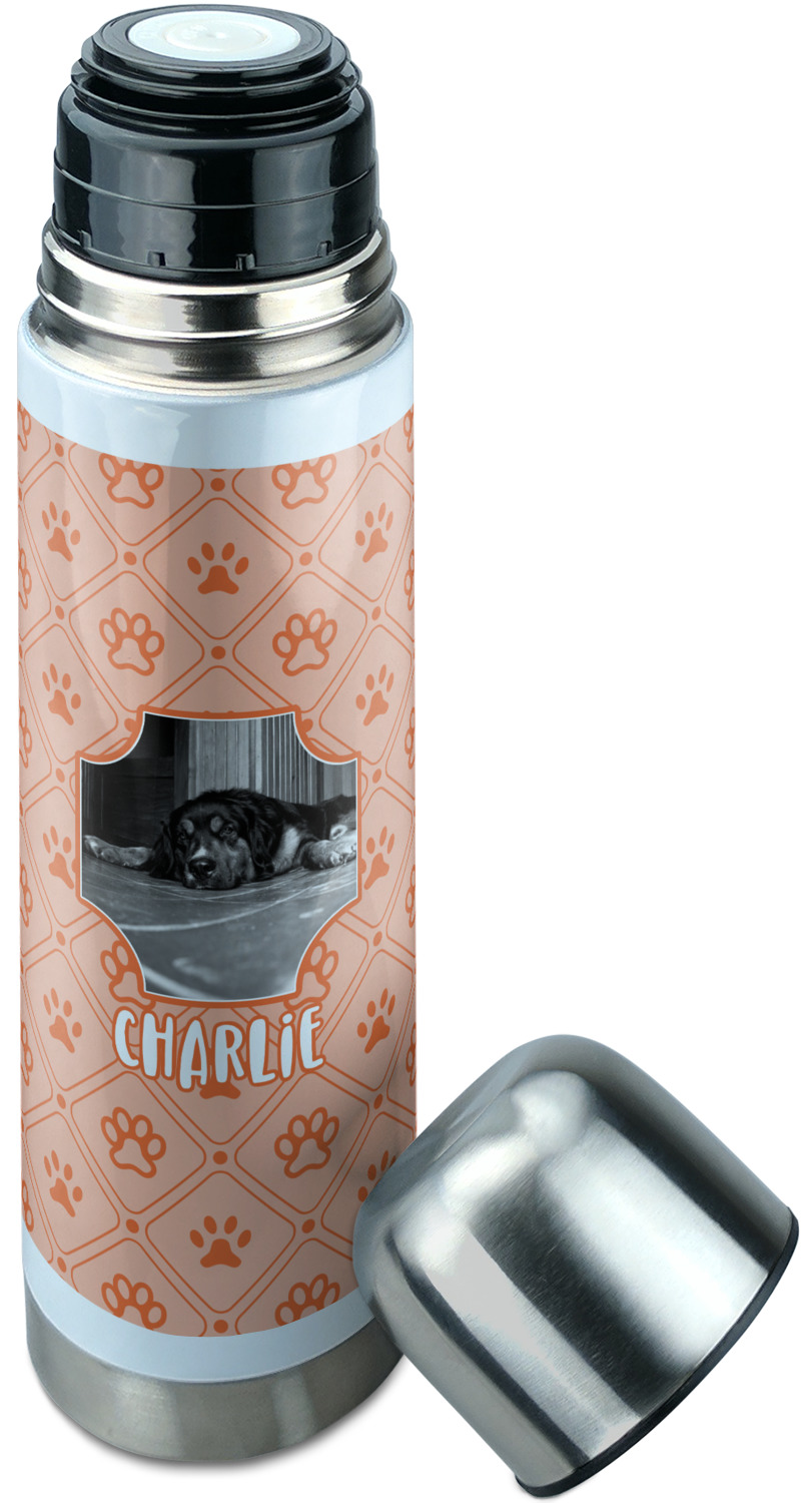 Manufactured from stainless steel, this thermos is built durably and double-walled insulated to preserve the temperature of your drink for hours. It also features a screw off lid that is made to also function as a small cup. Upon unscrewing this part of the thermos bottle, a pop-open, pour feature emerges. This feature allows you to slowly pour your beverage into your lid, ensuring a steady, controlled pour into your lid or other cup. With a capacity of 25 ounces, these large thermoses can hold several servings of your favorite beverage. Your customization is displayed all around the bottle with bright, vibrant color.