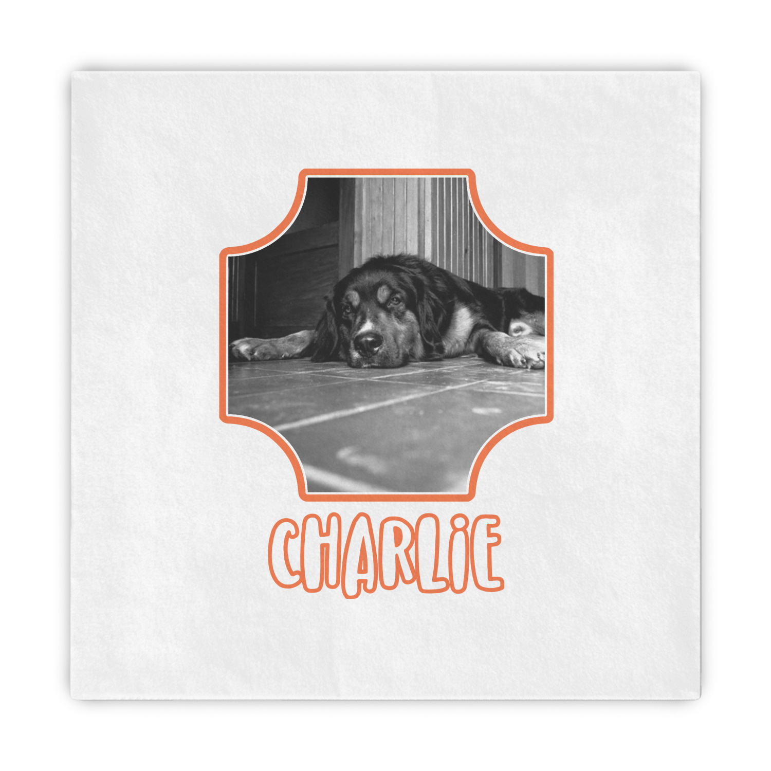 This design is a bright peach with accents of orange. In the middle, you can upload your favorite picture of your pet! It's a breeze with our design center. Underneath their picture, put their name or a fun saying. The background is filled with a fun pattern of pawprints and bones. This will be the perfect design for a sweet puppy.