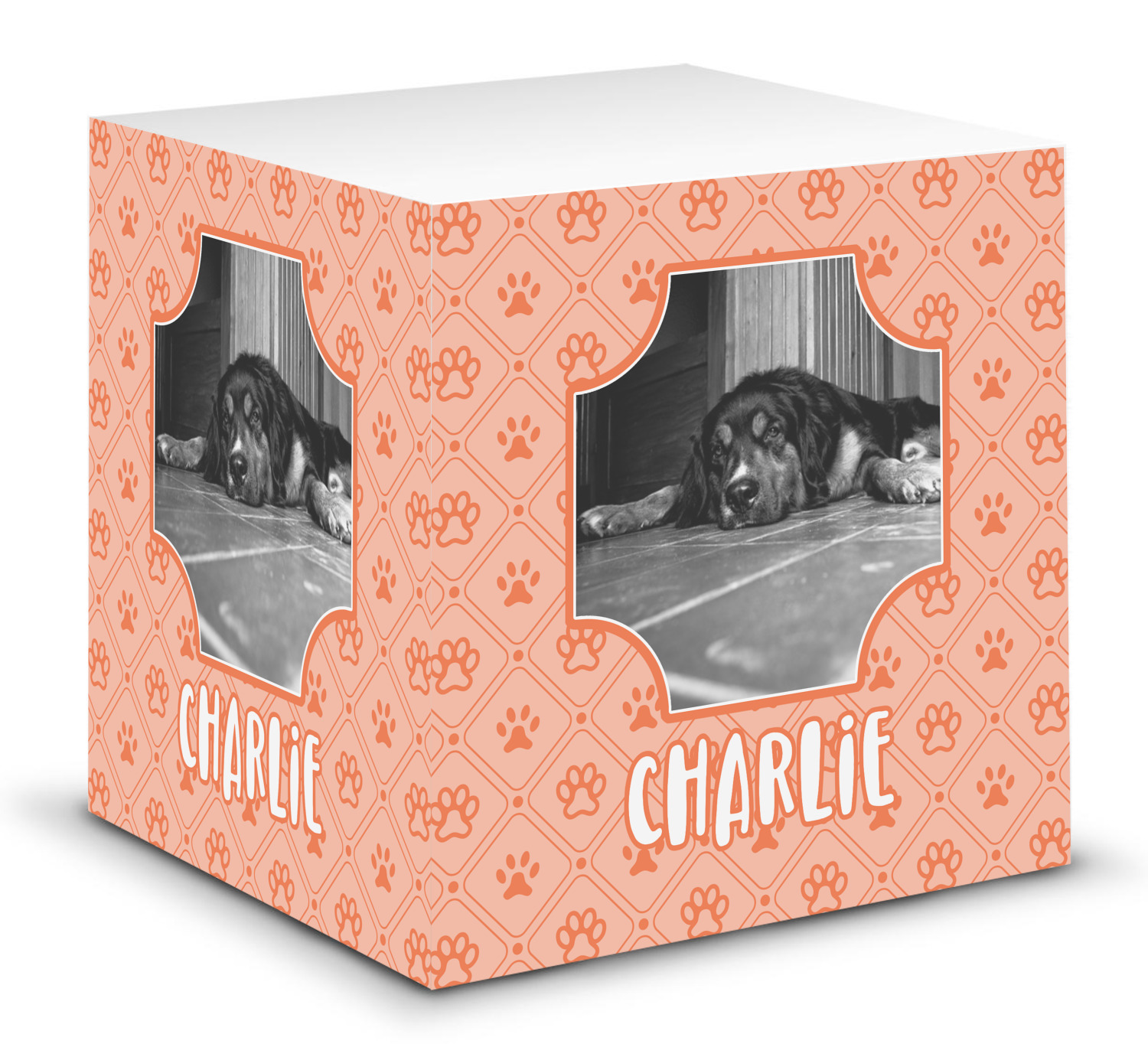 This note cube features 700 sheets of matte, white paper. Each sheet measures at 3.5 by 3.5 inches and has an adhesive strip at its top. Your personalized design is displayed on all four edges of the sticky pad.
