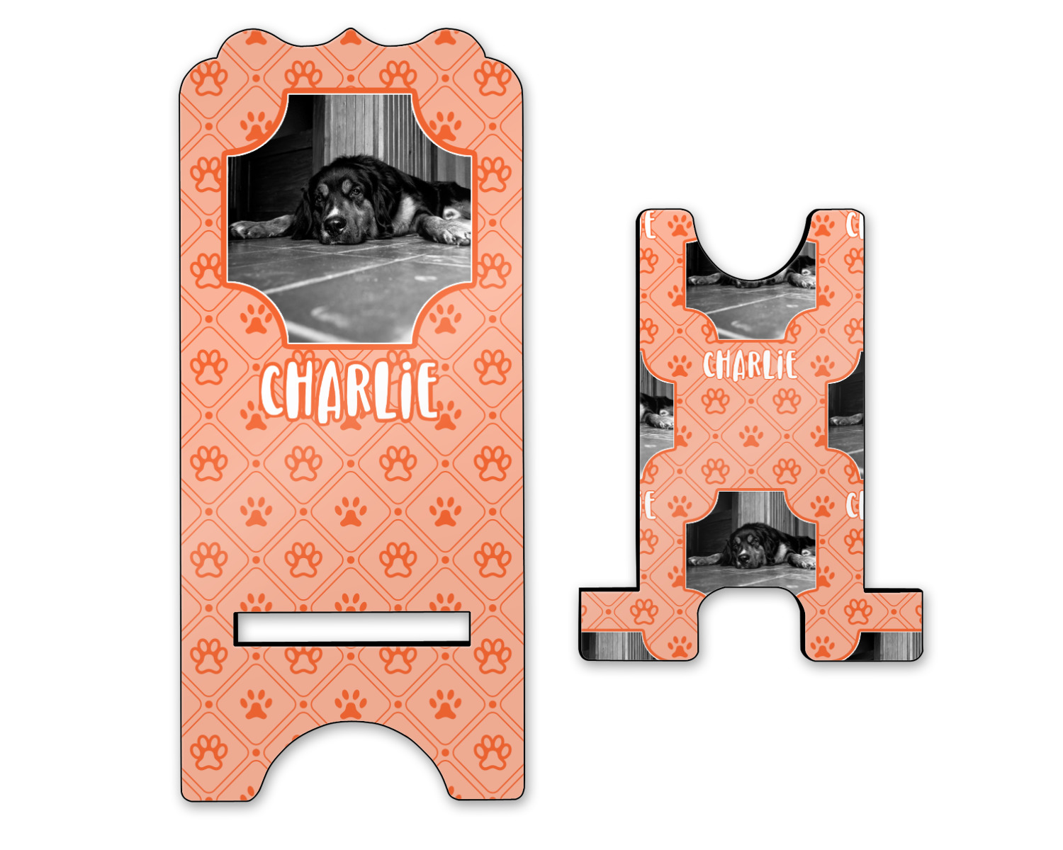 These cell phone holders are comprised of two hardboard pieces, that lock into and steady one another. The bottom part of the mobile phone stand is spacious enough to support both your phone and your charger, while it is not in use. We print your customization atop the face of this stand, while the remaining sides are a sophisticated, black color.