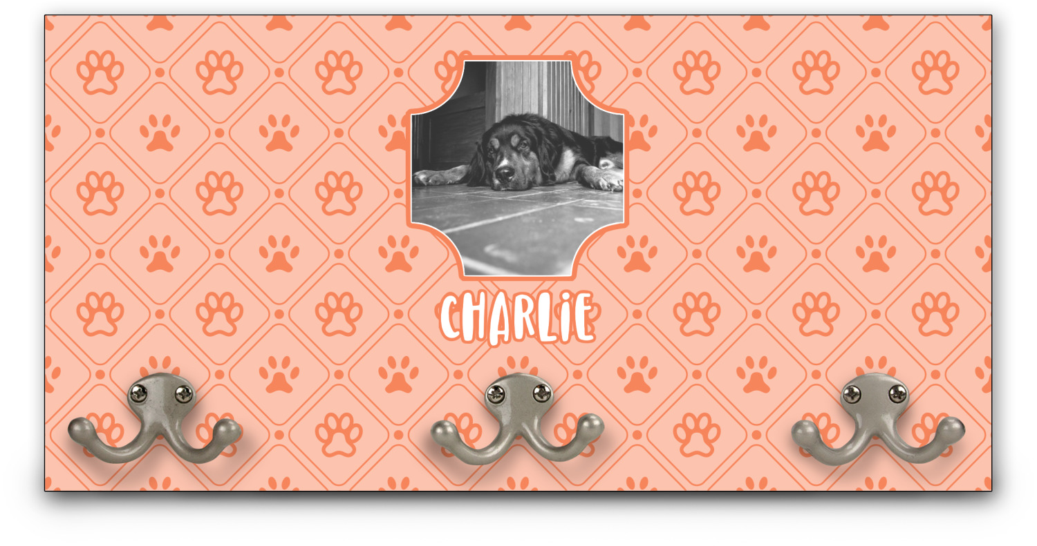 This coat rack is the perfect way to add some personality to your wall or entryway. The board is made of a strong maple that is approximately 16" x 8". The three 2-prong hooks are a sturdy metal that have three screws attaching them to the board. Your design is printed right onto the front of the board while the back and sides are a simple black.