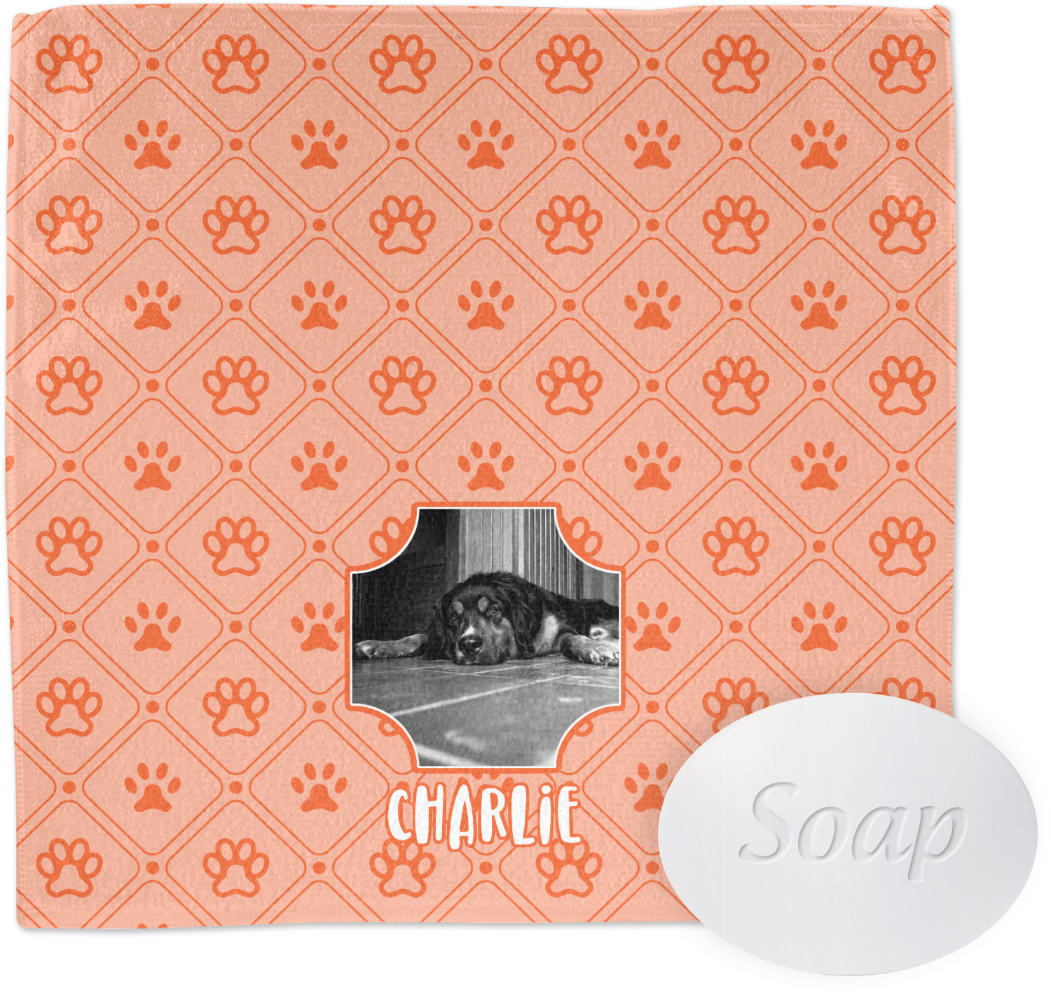 This design is a bright peach with accents of orange. In the middle, you can upload your favorite picture of your pet! It's a breeze with our design center. Underneath their picture, put their name or a fun saying. The background is filled with a fun pattern of pawprints and bones. This will be the perfect design for a sweet puppy.