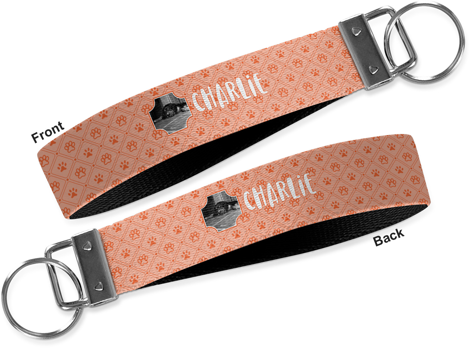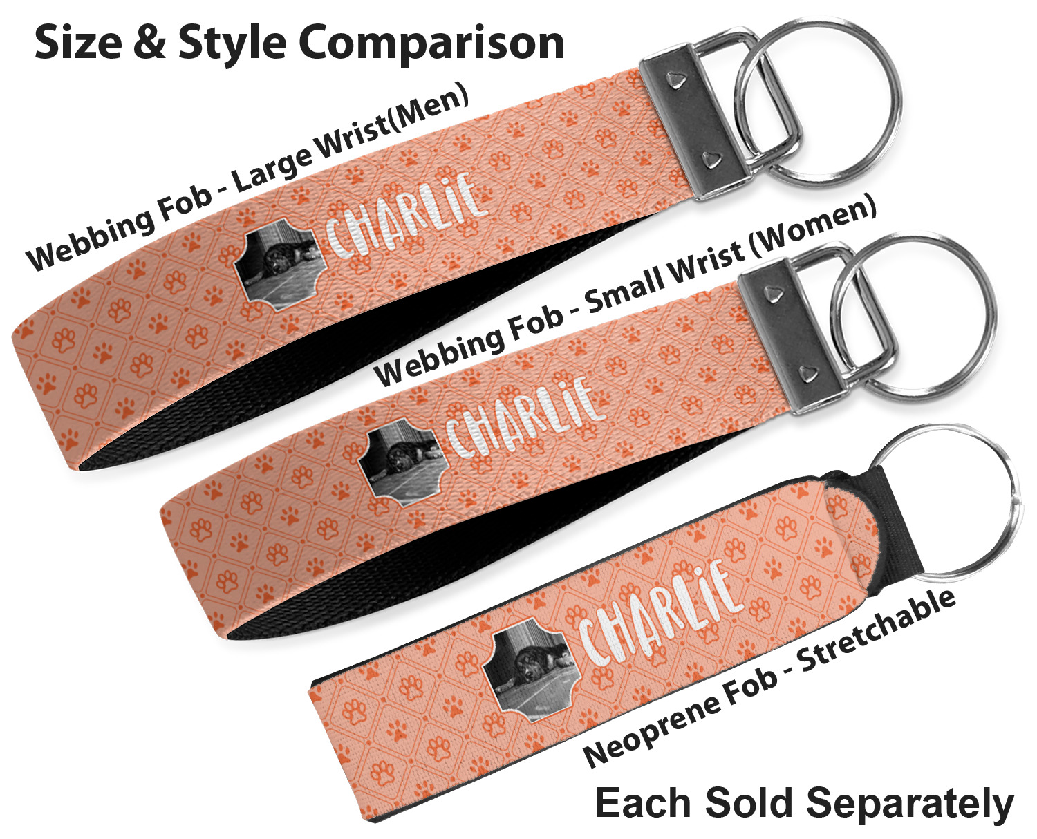 These key fob keychains are made from a polyester weave, right here in the USA. They feature a silver, metal clasp, attached to a round keyring. The piece gives the personalized wristlet a beautiful, finished look. Your customized design is printed on the outside of the keychain strap. We carry these wristlets in two sizes: small, which is 5 inches in width, and large, which is 5.5 inches in width.