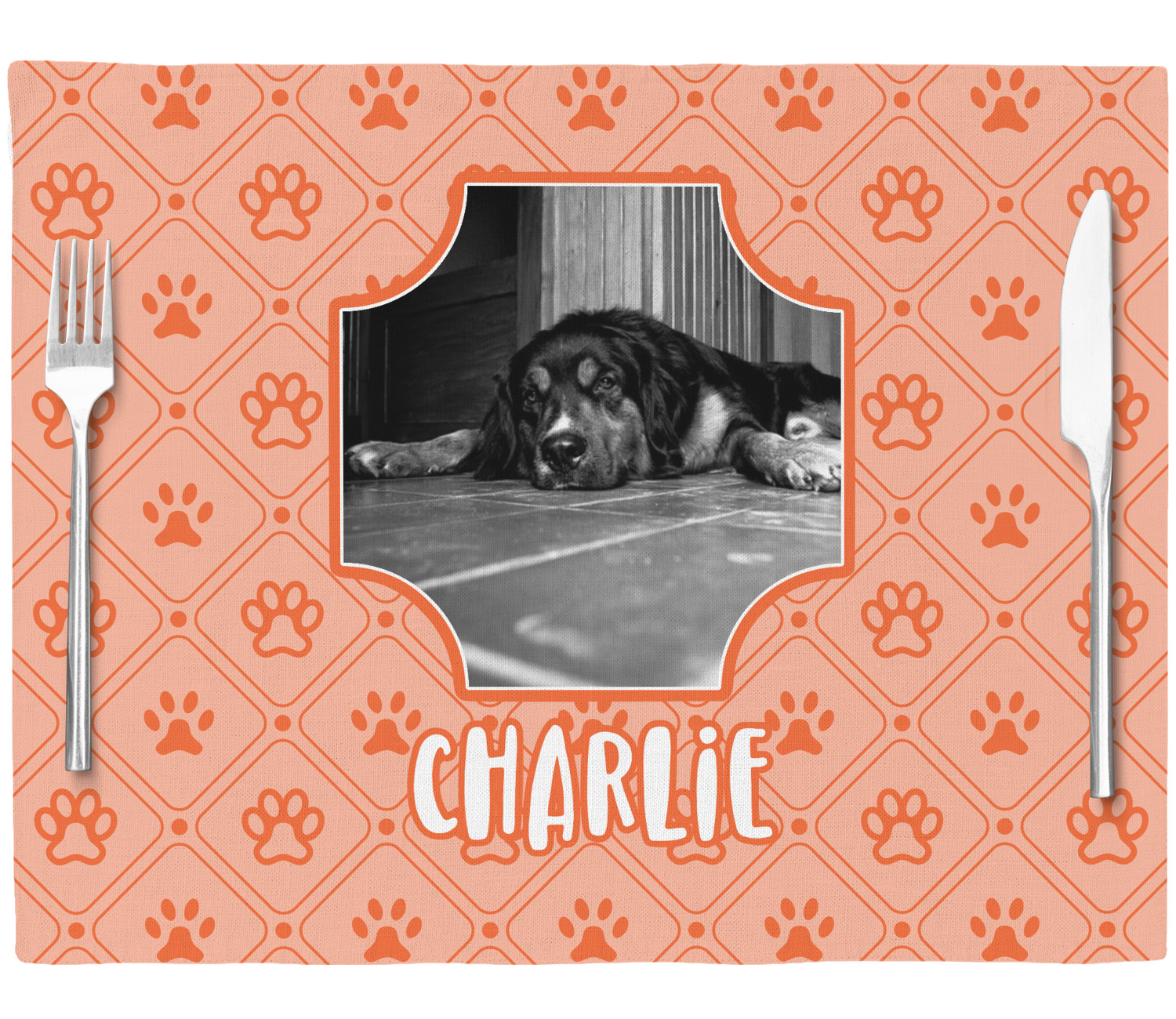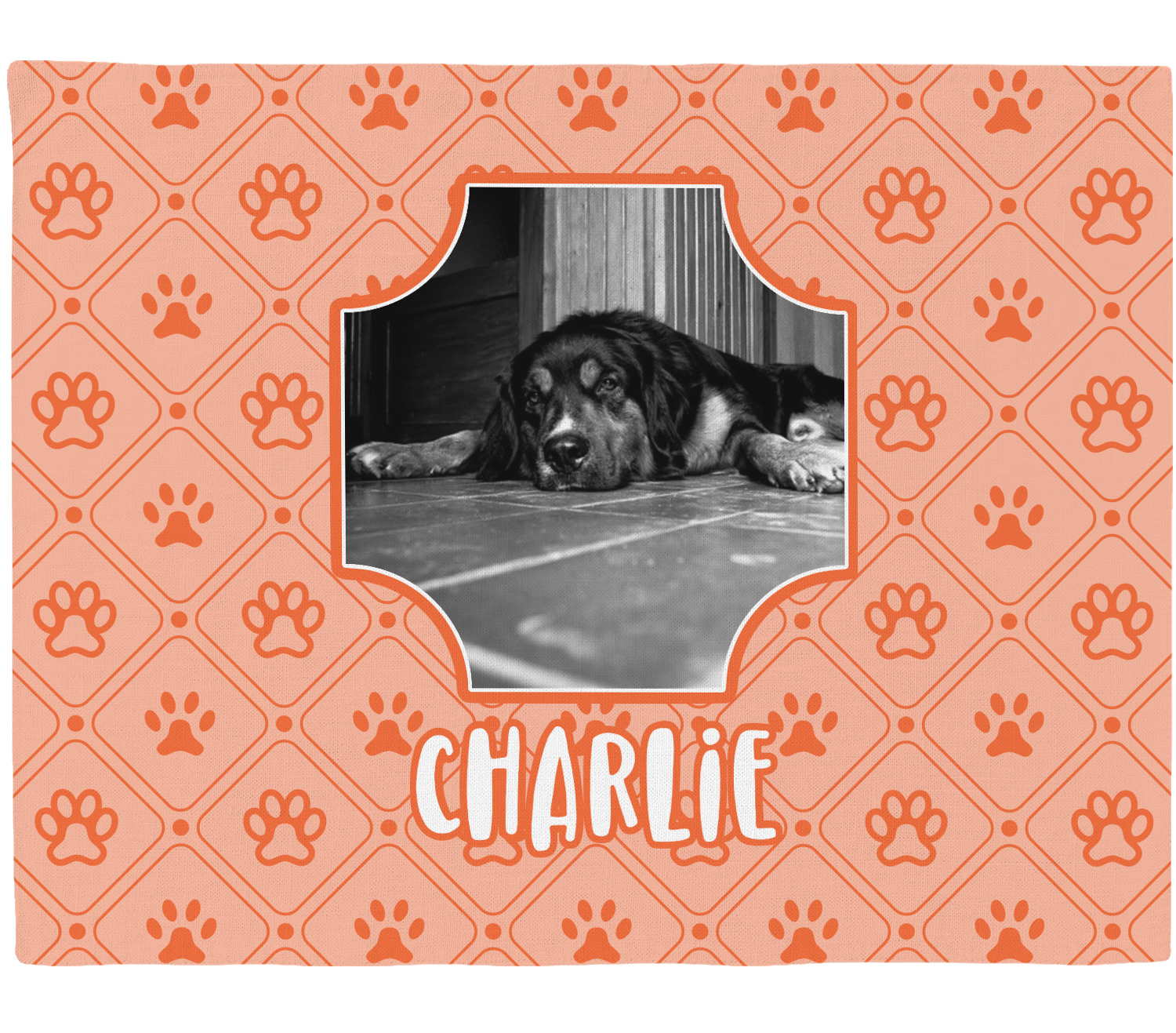 This design is a bright peach with accents of orange. In the middle, you can upload your favorite picture of your pet! It's a breeze with our design center. Underneath their picture, put their name or a fun saying. The background is filled with a fun pattern of pawprints and bones. This will be the perfect design for a sweet puppy.