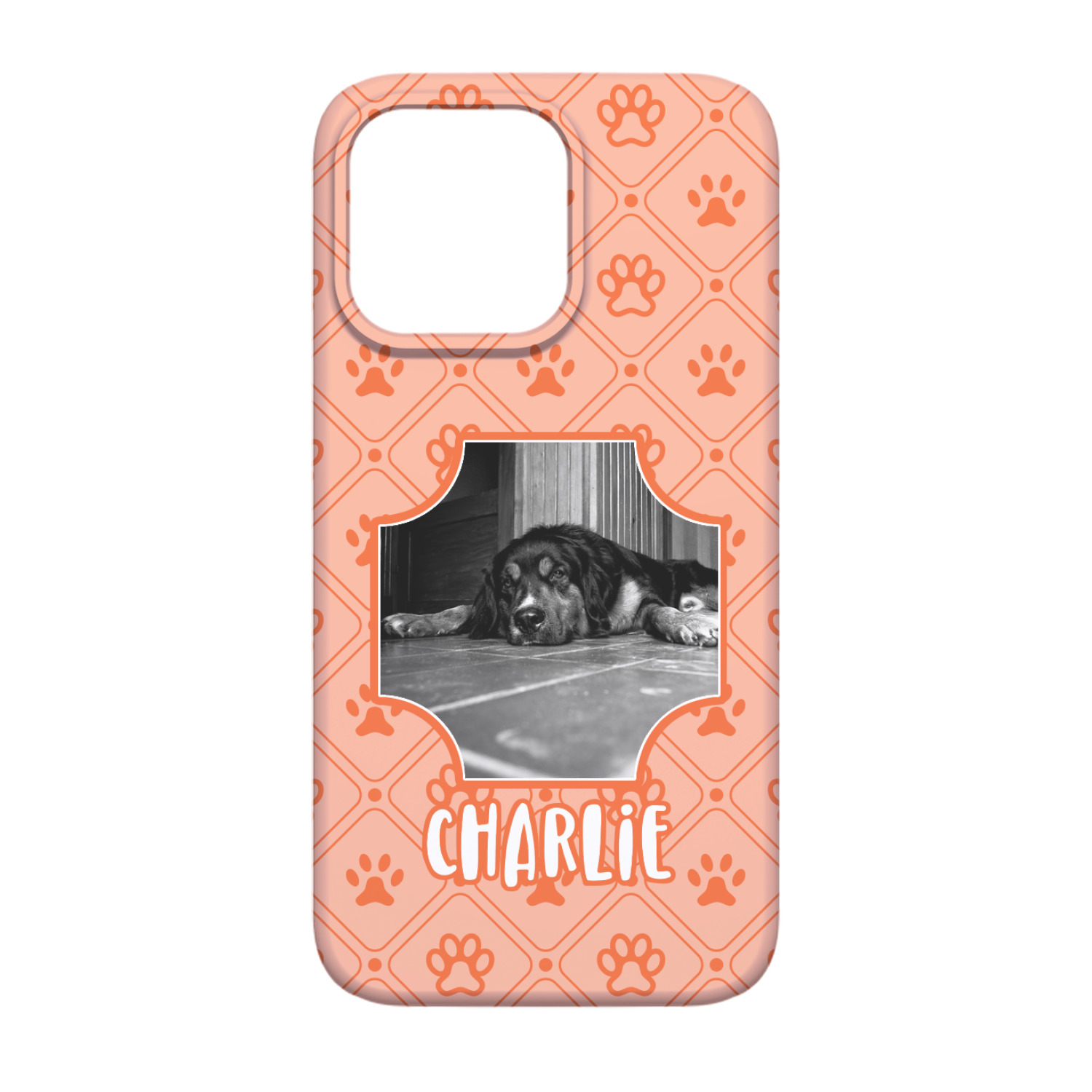This design is a bright peach with accents of orange. In the middle, you can upload your favorite picture of your pet! It's a breeze with our design center. Underneath their picture, put their name or a fun saying. The background is filled with a fun pattern of pawprints and bones. This will be the perfect design for a sweet puppy.