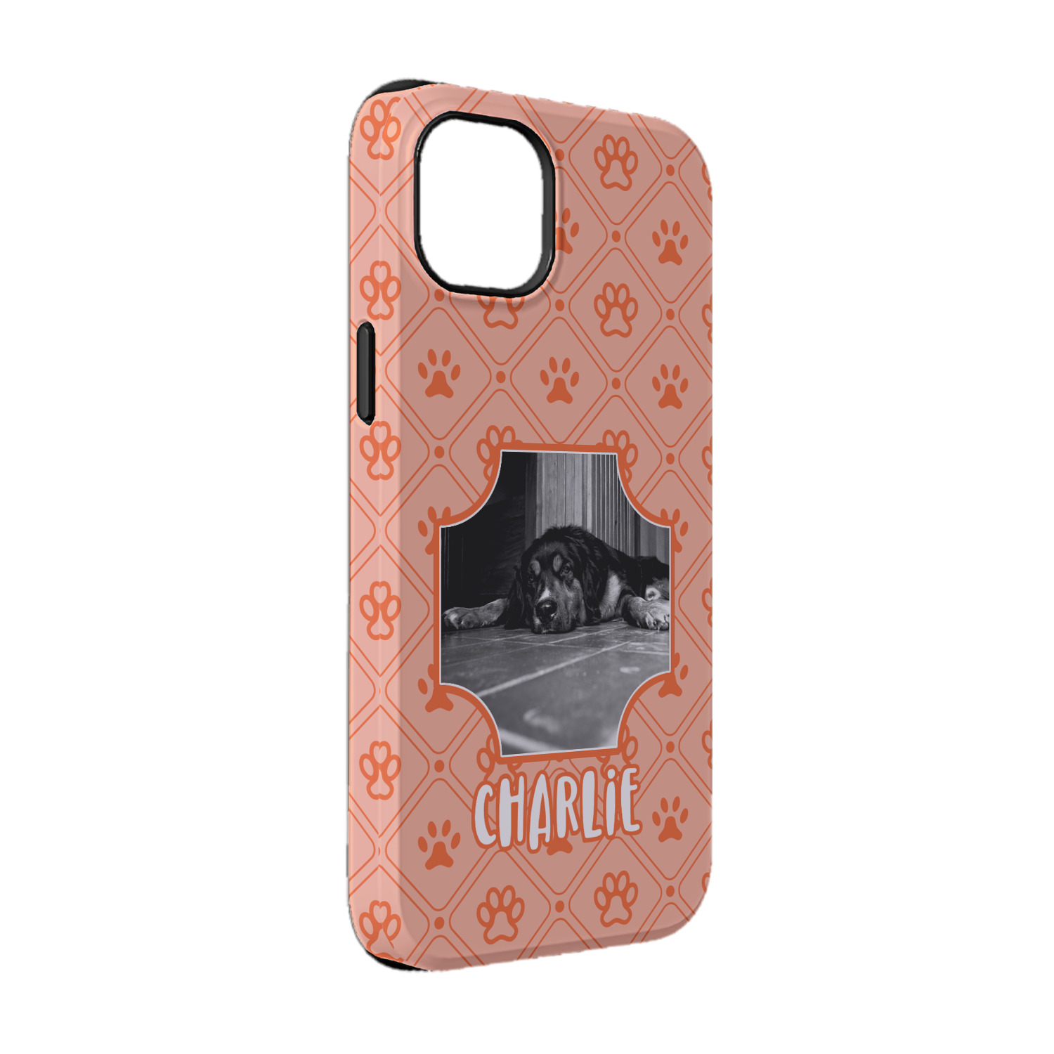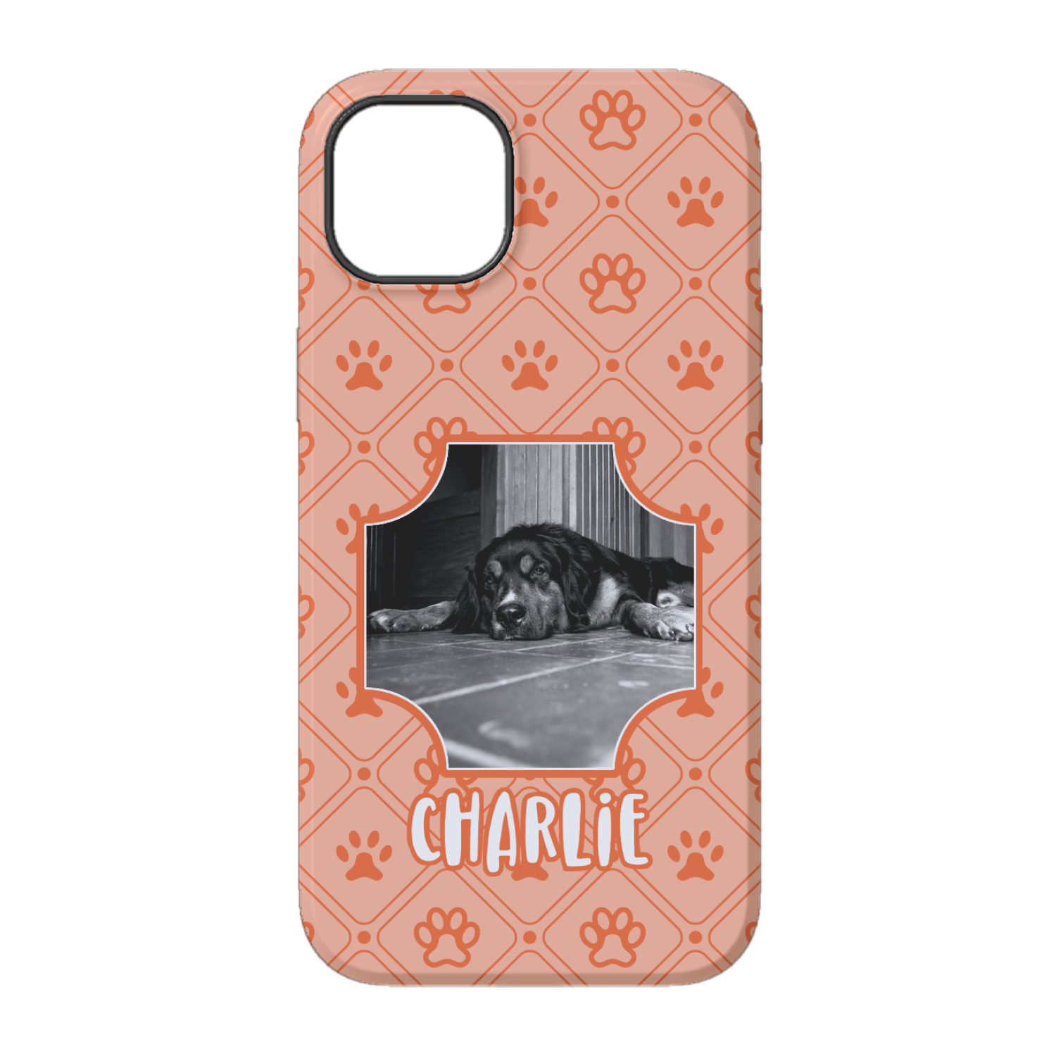 This design is a bright peach with accents of orange. In the middle, you can upload your favorite picture of your pet! It's a breeze with our design center. Underneath their picture, put their name or a fun saying. The background is filled with a fun pattern of pawprints and bones. This will be the perfect design for a sweet puppy.