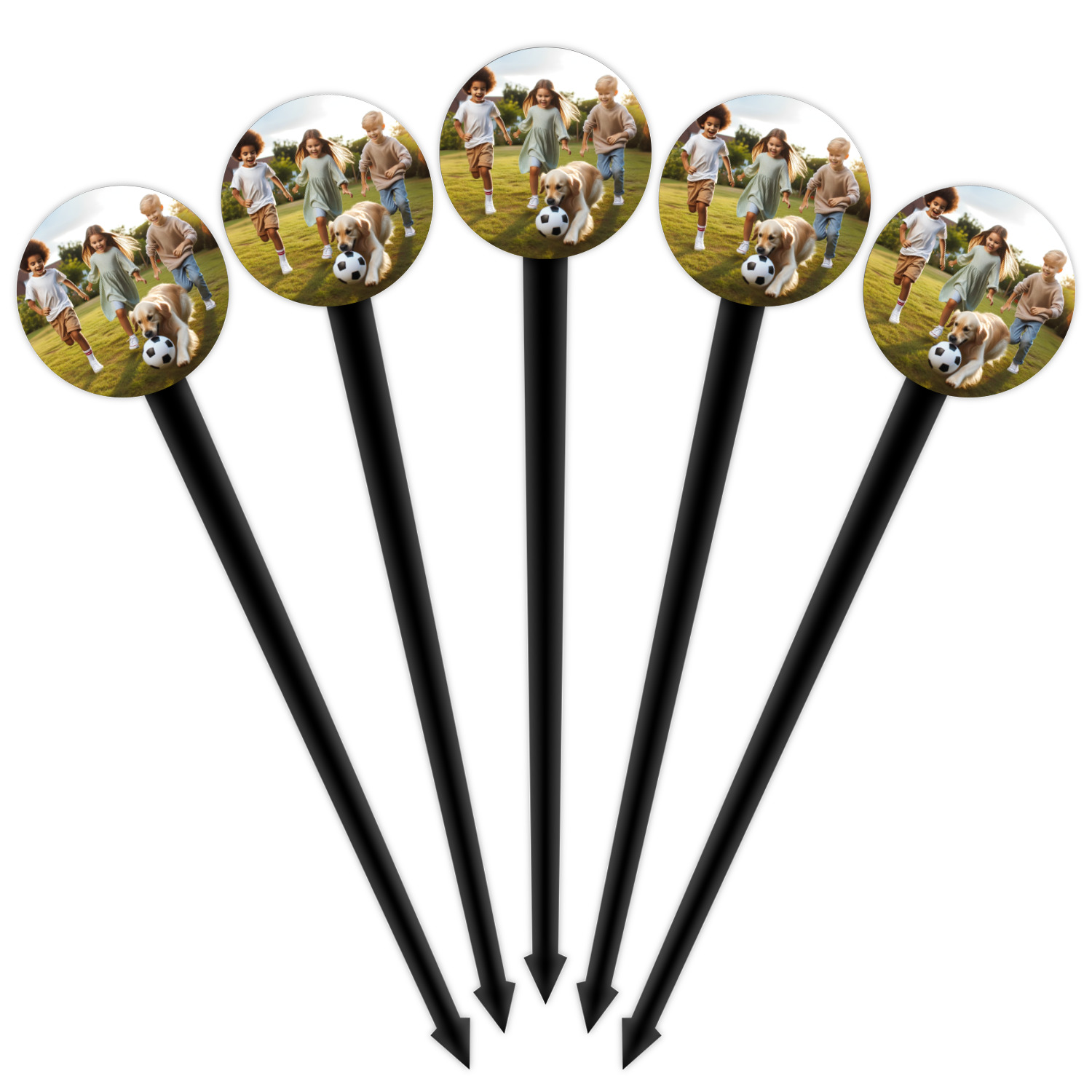 The round disc on these food & drink picks can be customized and personalized to your specifications. Your image will be printed in full color on one side or both sides. You can use the same image on both sides or use two different images.