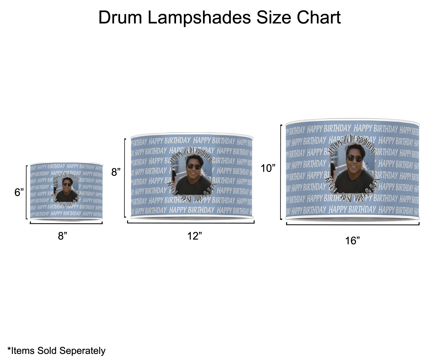 Our customized lamp shades also come in 3 different sizes: 8", 12" and 16", measuring at 8" in diameter by 6" tall, 12" in diameter by 8" tall, and 16" in diameter by 10" tall, respectively.