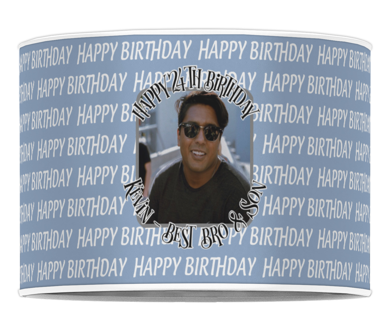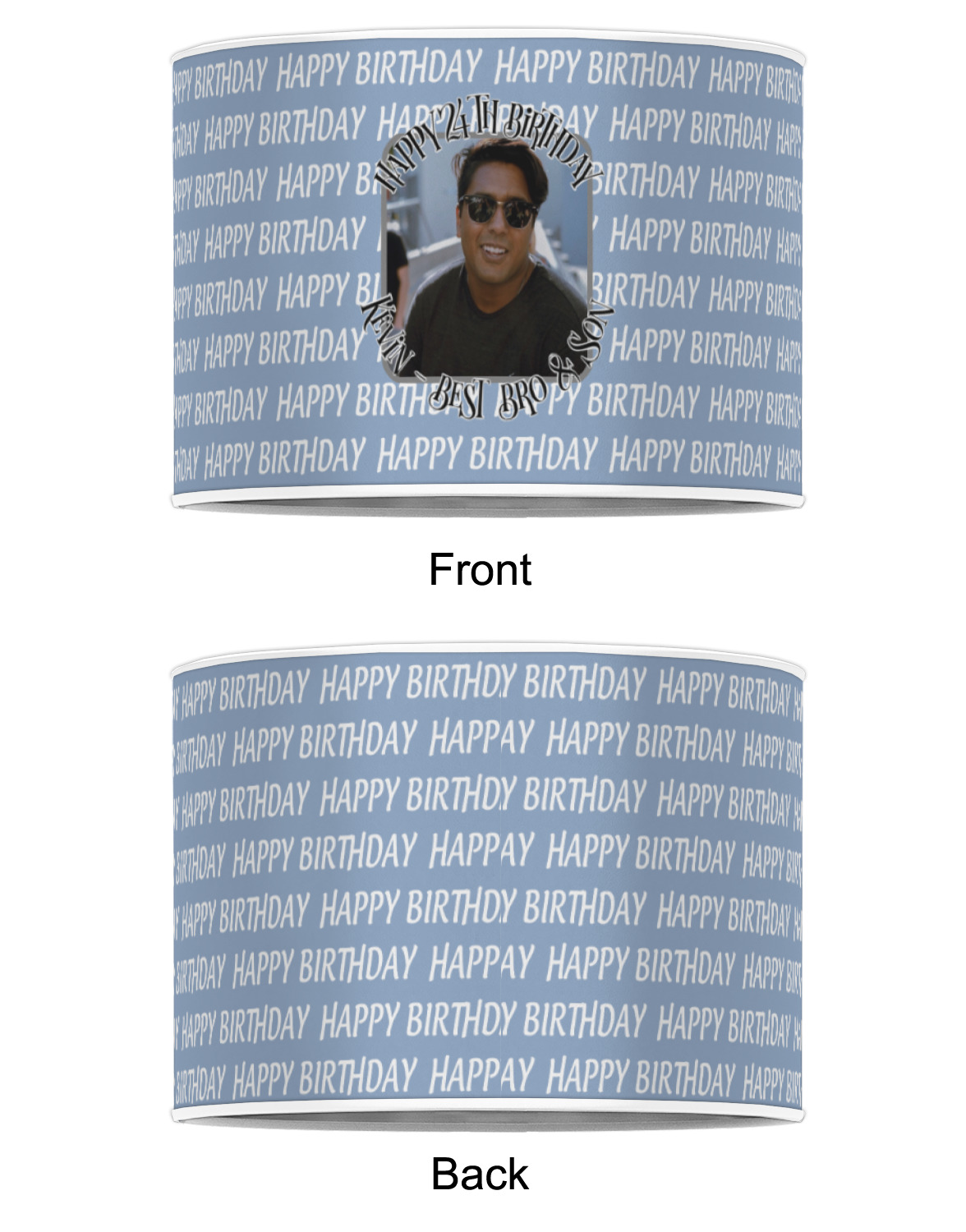 This design has a subtle background that says "Happy Birthday". You are able to upload your own picture of the birthday boy or girl right onto your design. The personalized text goes above and below your picture. This is a great design for pictures of you and the birthday boy/girl, so they can look at that cherished memory every day.