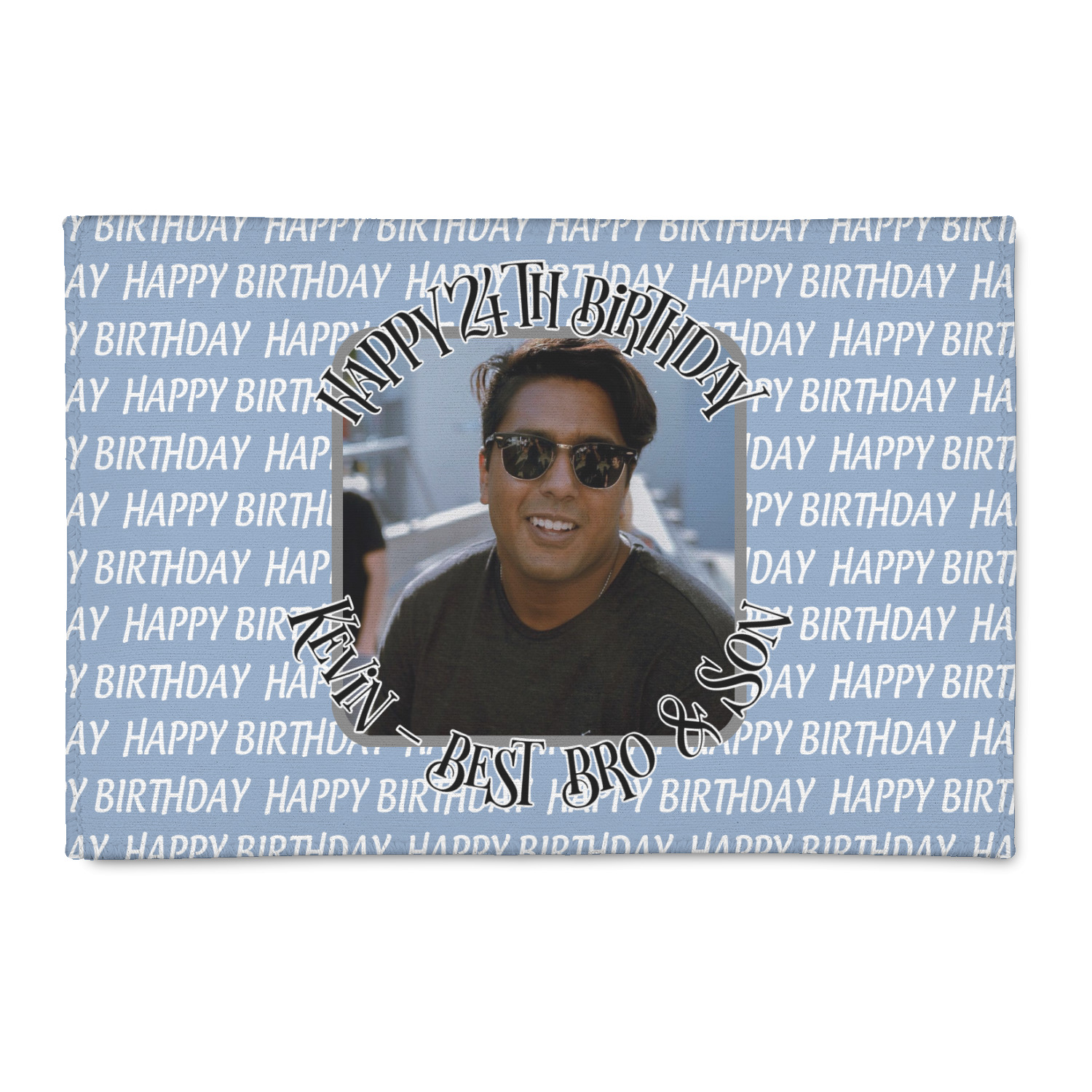 This design has a subtle background that says "Happy Birthday". You are able to upload your own picture of the birthday boy or girl right onto your design. The personalized text goes above and below your picture. This is a great design for pictures of you and the birthday boy/girl, so they can look at that cherished memory every day.