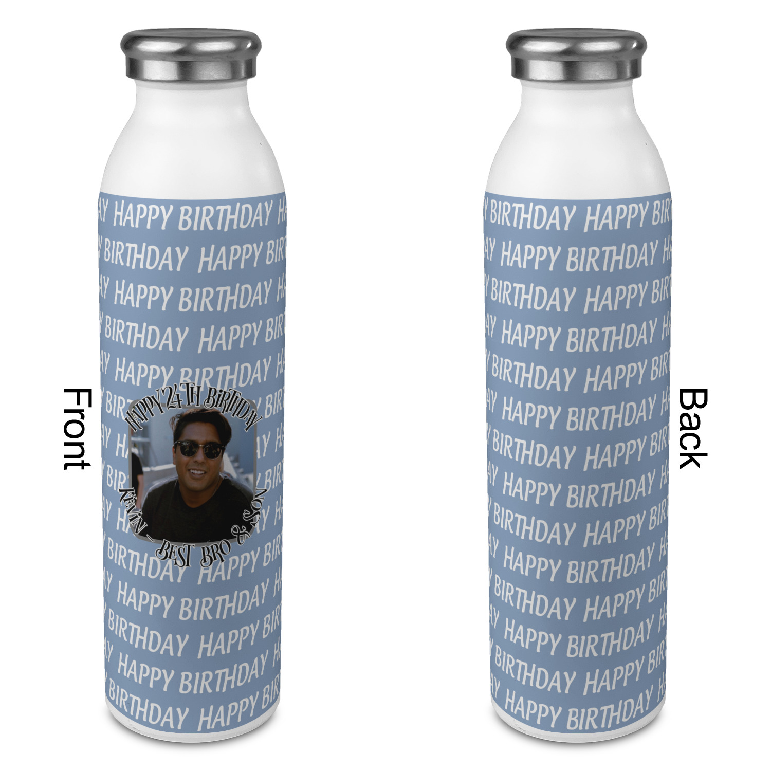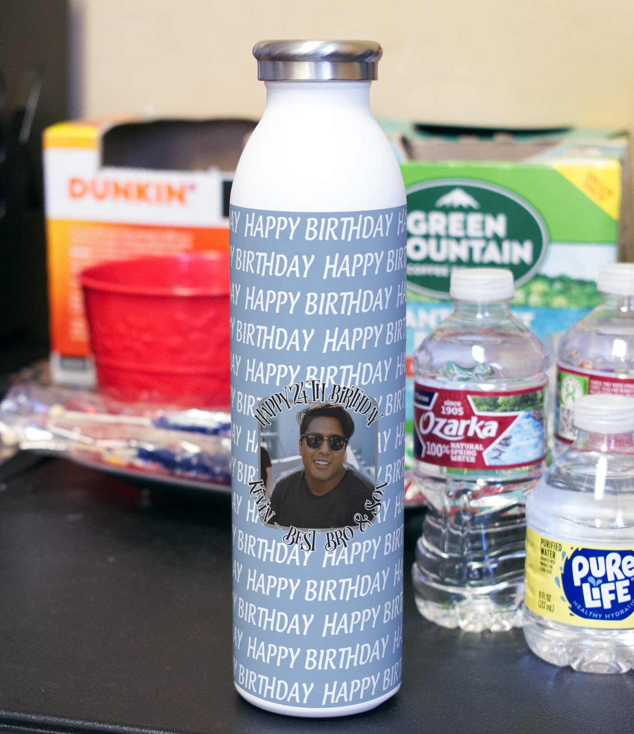 This design has a subtle background that says "Happy Birthday". You are able to upload your own picture of the birthday boy or girl right onto your design. The personalized text goes above and below your picture. This is a great design for pictures of you and the birthday boy/girl, so they can look at that cherished memory every day.