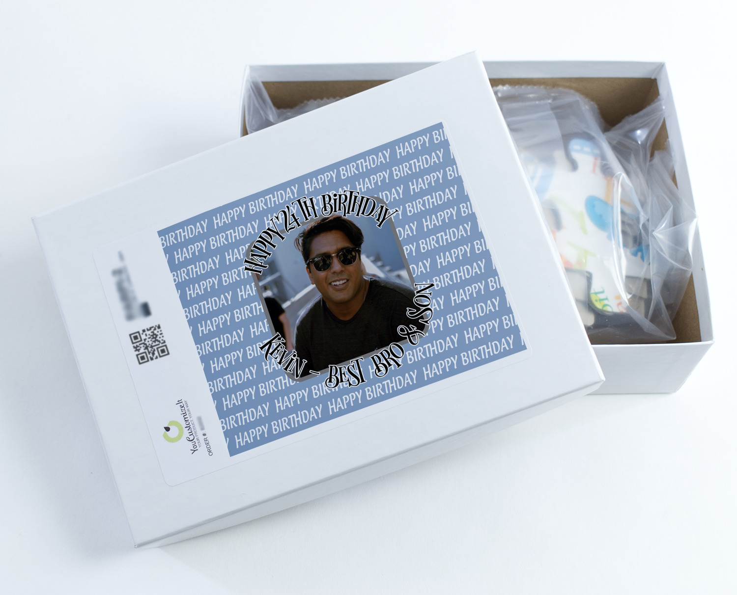 This design has a subtle background that says "Happy Birthday". You are able to upload your own picture of the birthday boy or girl right onto your design. The personalized text goes above and below your picture. This is a great design for pictures of you and the birthday boy/girl, so they can look at that cherished memory every day.