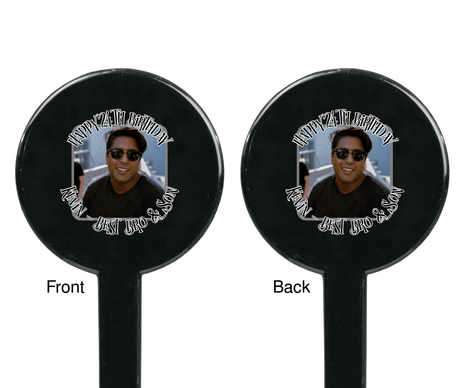 This design has a subtle background that says "Happy Birthday". You are able to upload your own picture of the birthday boy or girl right onto your design. The personalized text goes above and below your picture. This is a great design for pictures of you and the birthday boy/girl, so they can look at that cherished memory every day.