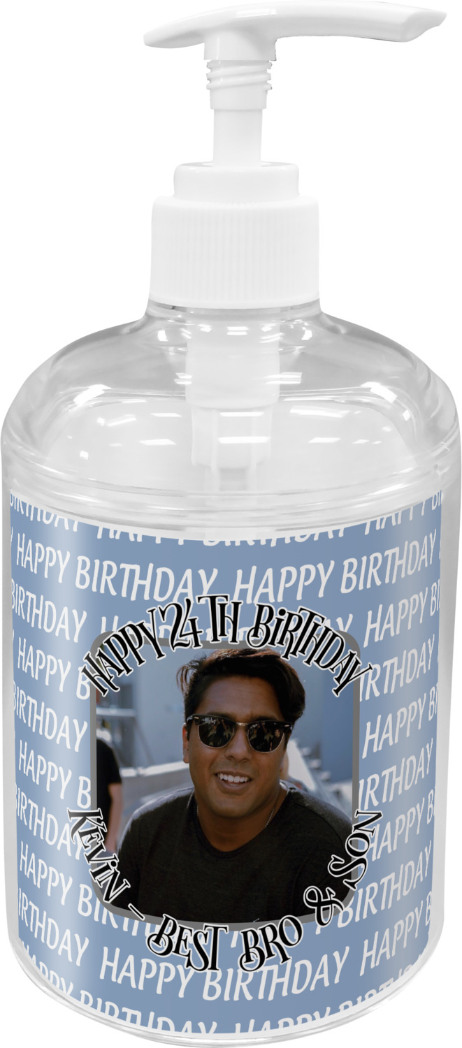 This design has a subtle background that says "Happy Birthday". You are able to upload your own picture of the birthday boy or girl right onto your design. The personalized text goes above and below your picture. This is a great design for pictures of you and the birthday boy/girl, so they can look at that cherished memory every day.