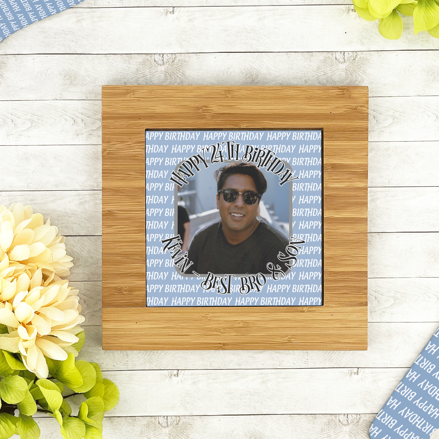 This design has a subtle background that says "Happy Birthday". You are able to upload your own picture of the birthday boy or girl right onto your design. The personalized text goes above and below your picture. This is a great design for pictures of you and the birthday boy/girl, so they can look at that cherished memory every day.