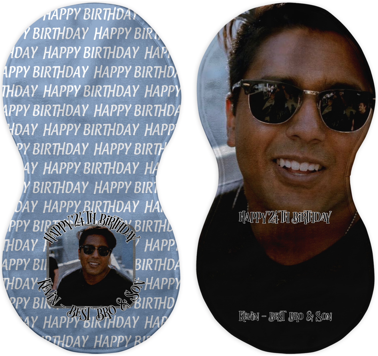 This design has a subtle background that says "Happy Birthday". You are able to upload your own picture of the birthday boy or girl right onto your design. The personalized text goes above and below your picture. This is a great design for pictures of you and the birthday boy/girl, so they can look at that cherished memory every day.