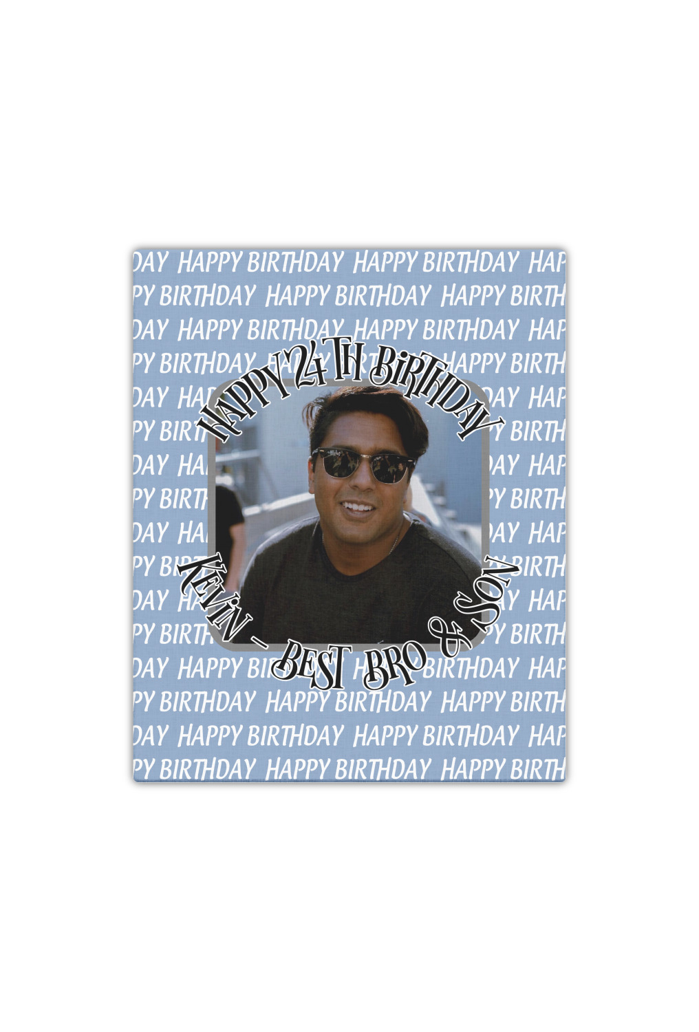 This design has a subtle background that says "Happy Birthday". You are able to upload your own picture of the birthday boy or girl right onto your design. The personalized text goes above and below your picture. This is a great design for pictures of you and the birthday boy/girl, so they can look at that cherished memory every day.