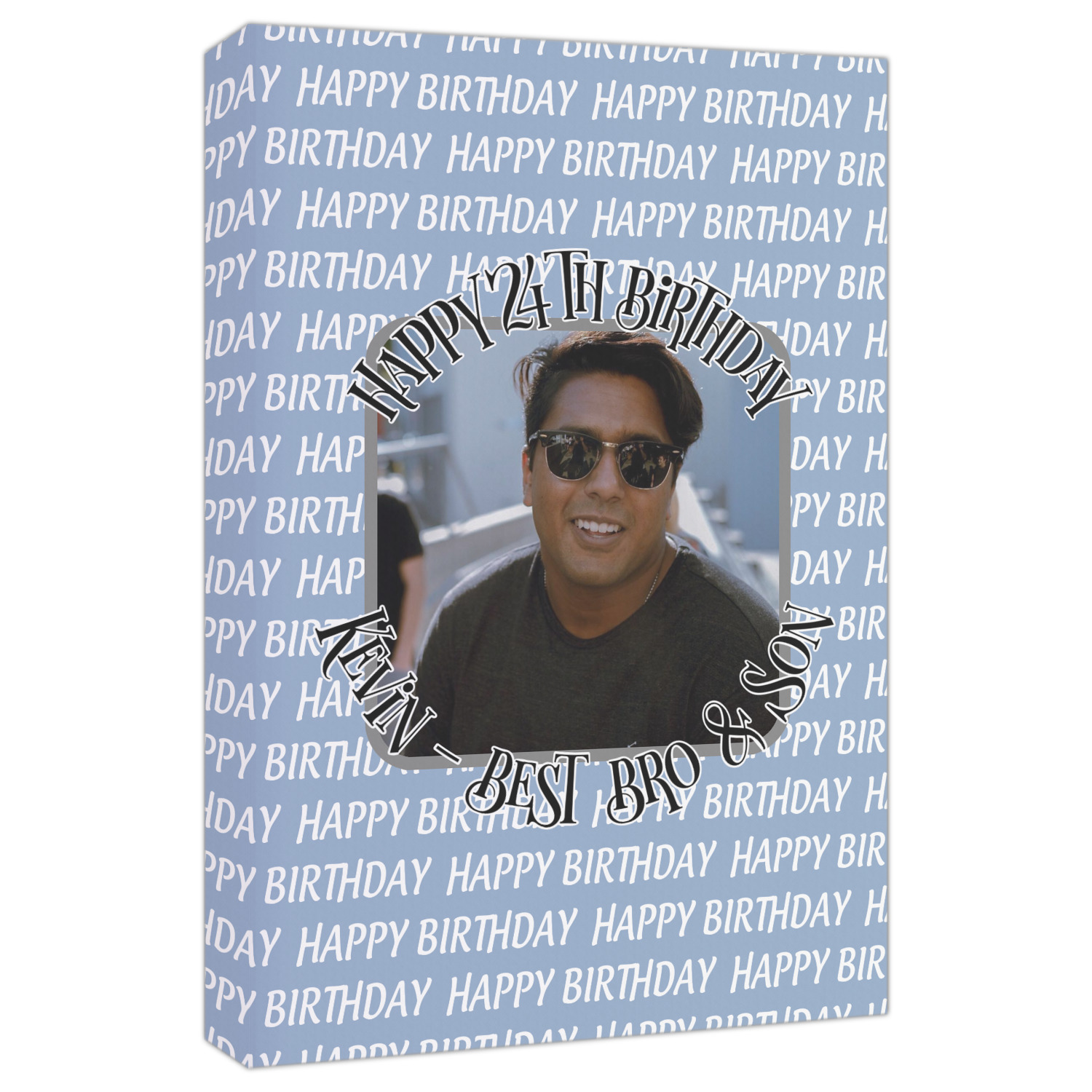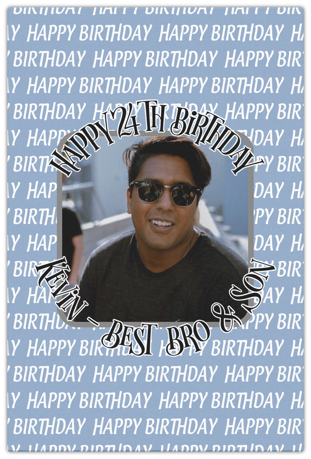 This design has a subtle background that says "Happy Birthday". You are able to upload your own picture of the birthday boy or girl right onto your design. The personalized text goes above and below your picture. This is a great design for pictures of you and the birthday boy/girl, so they can look at that cherished memory every day.