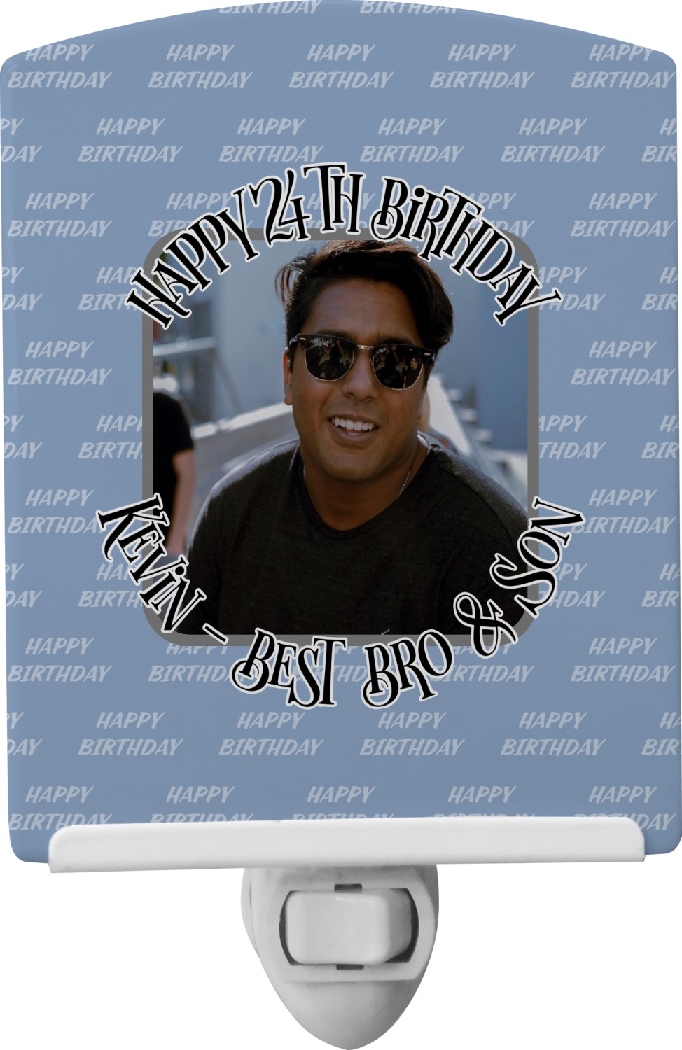 This design has a subtle background that says "Happy Birthday". You are able to upload your own picture of the birthday boy or girl right onto your design. The personalized text goes above and below your picture. This is a great design for pictures of you and the birthday boy/girl, so they can look at that cherished memory every day.