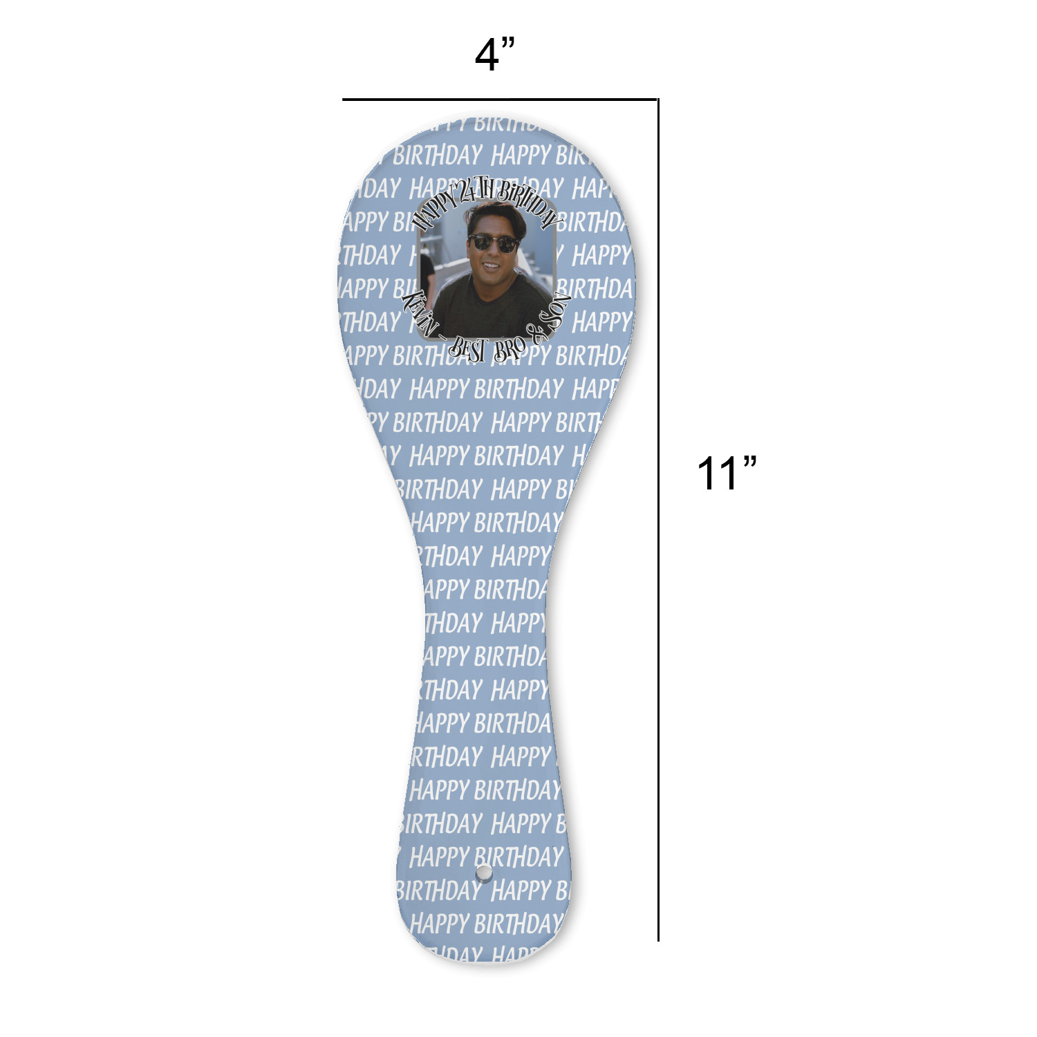 This design has a subtle background that says "Happy Birthday". You are able to upload your own picture of the birthday boy or girl right onto your design. The personalized text goes above and below your picture. This is a great design for pictures of you and the birthday boy/girl, so they can look at that cherished memory every day.