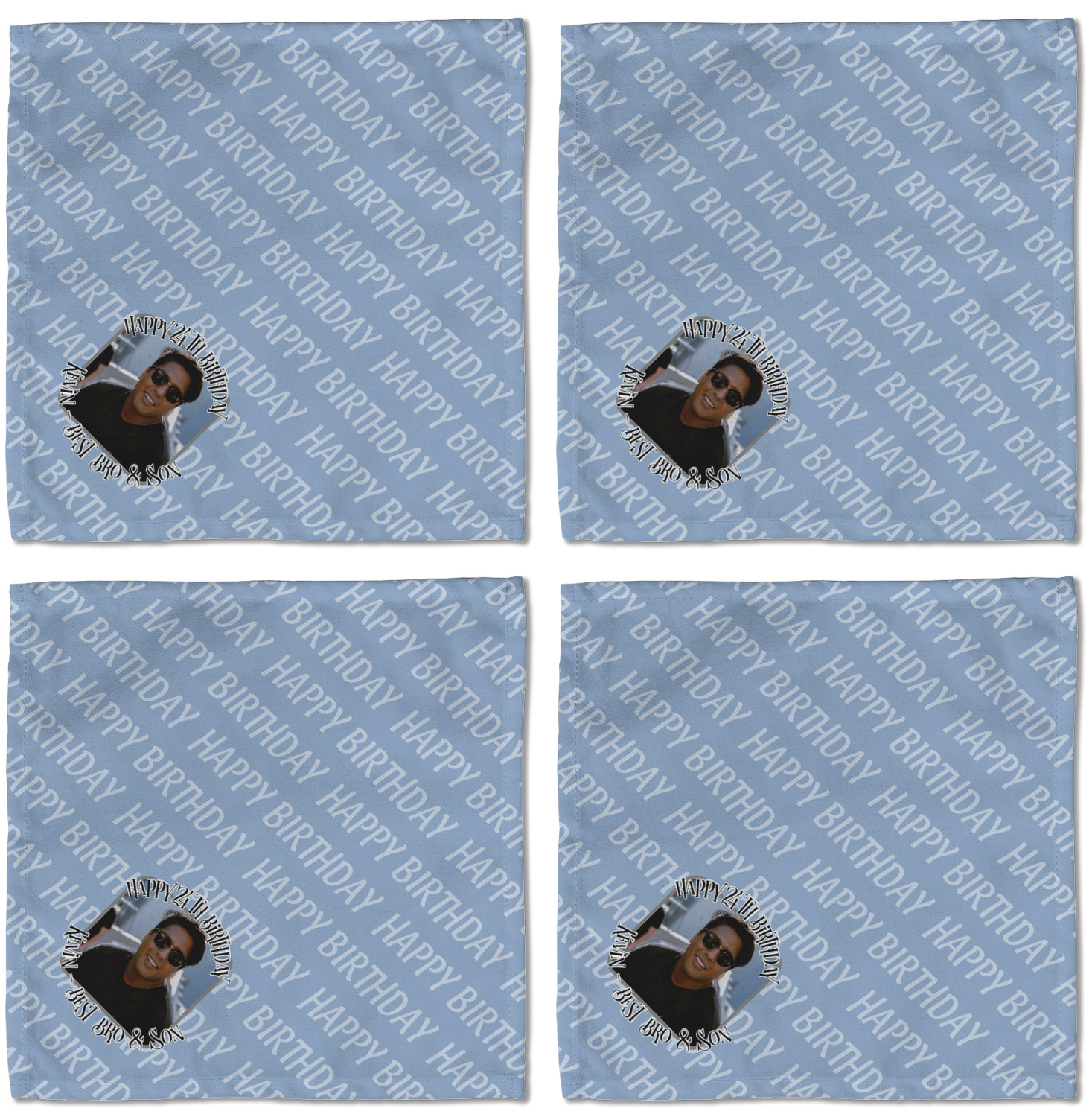 Each customizable cloth napkin is a polyester material guaranteed for long-term use. Since our napkins are cloth, it serves as a great reusable and eco-friendly dining decor. We sell personalized napkins individually or as a set of 4! Print your own unique design on all four napkins, or create four individual designs for each napkin! We offer two different napkin sizes - Cocktail napkins (approx. 10 x 10) and Dinner napkins (approx. 20 x 20). We print your design on one side, perfect for displaying your custom designed lunch napkins in any fold or table setting!