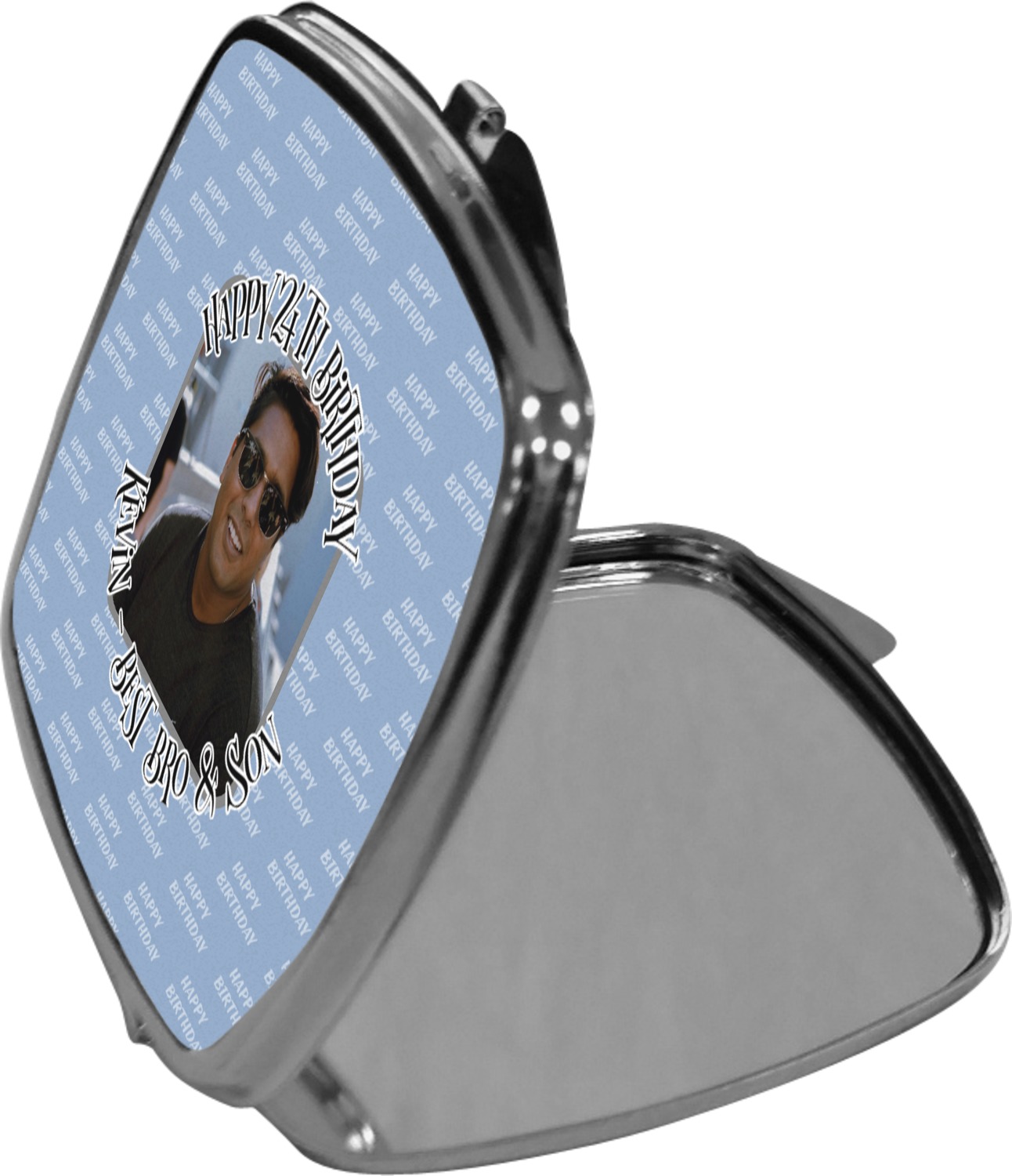 Our compact mirrors are customized with your design on one side. The other side is patterned silver tone metal. Inside, there are two mirrors.