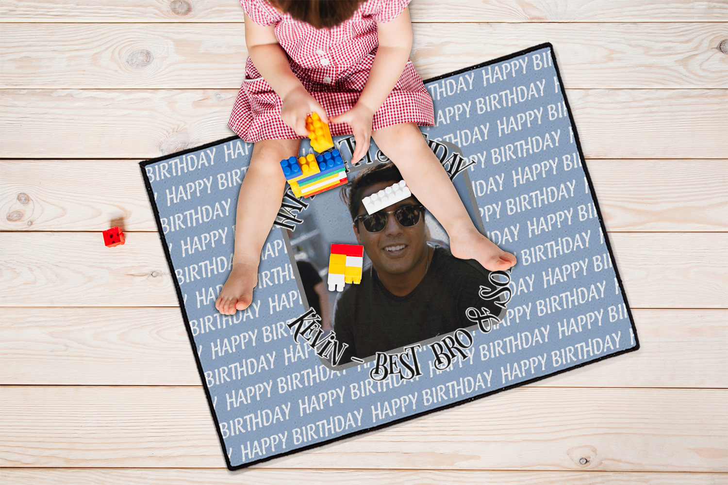 This design has a subtle background that says "Happy Birthday". You are able to upload your own picture of the birthday boy or girl right onto your design. The personalized text goes above and below your picture. This is a great design for pictures of you and the birthday boy/girl, so they can look at that cherished memory every day.