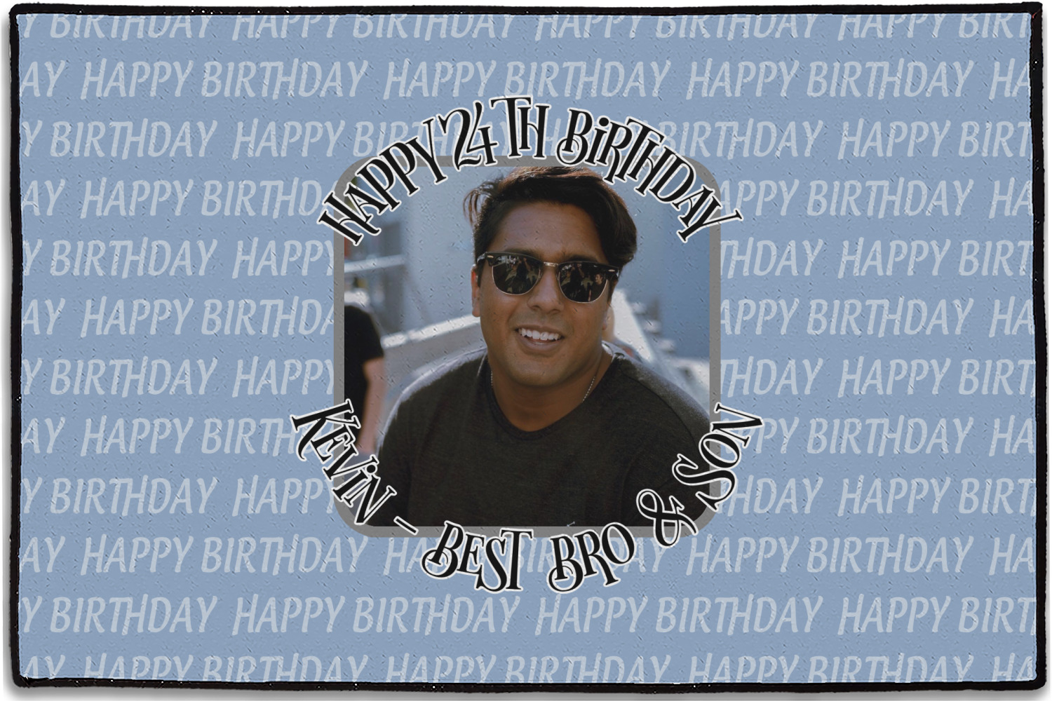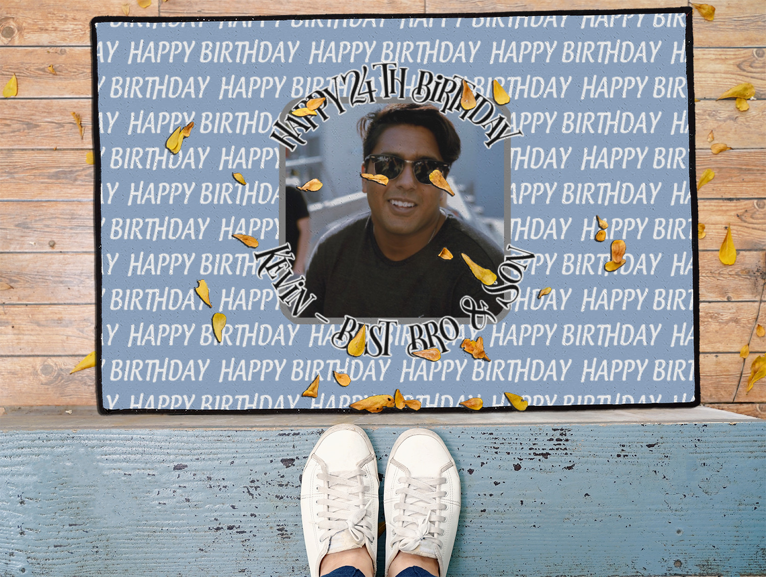 This design has a subtle background that says "Happy Birthday". You are able to upload your own picture of the birthday boy or girl right onto your design. The personalized text goes above and below your picture. This is a great design for pictures of you and the birthday boy/girl, so they can look at that cherished memory every day.