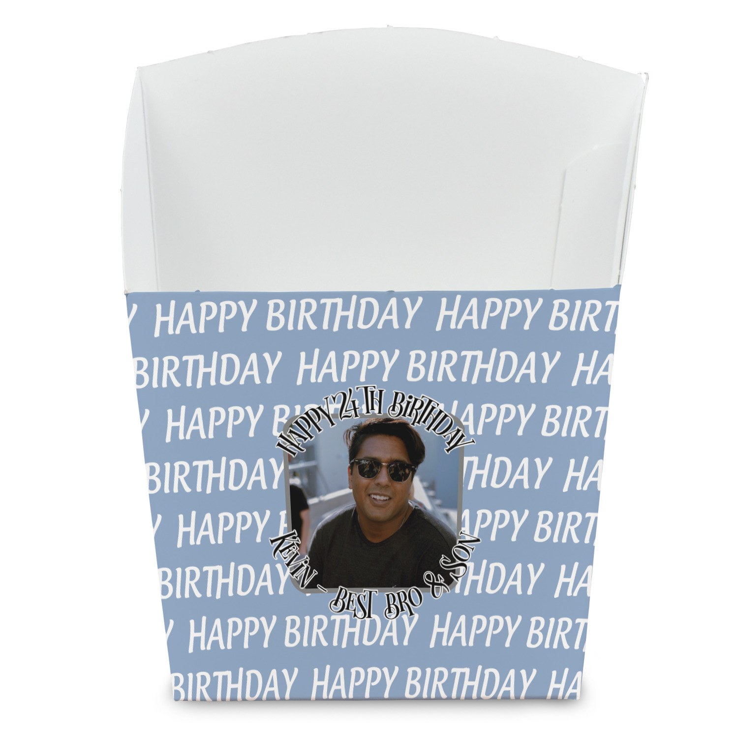 This design has a subtle background that says "Happy Birthday". You are able to upload your own picture of the birthday boy or girl right onto your design. The personalized text goes above and below your picture. This is a great design for pictures of you and the birthday boy/girl, so they can look at that cherished memory every day.