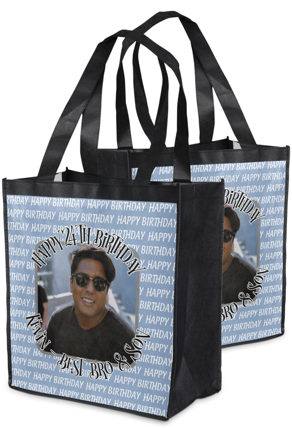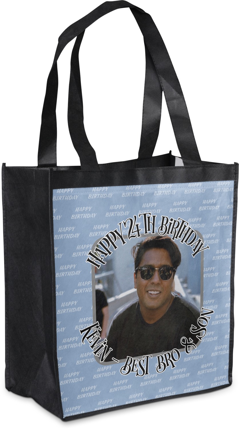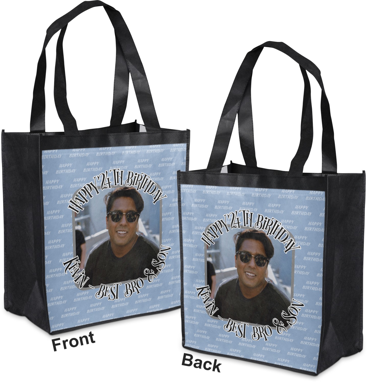 Made from a durable, biodegradable material, these reusable shopping bags can support up to 30 pounds of weight. With two large handles, measuring at 8.5 inches each, these personalized tote bags are easy to carry to your vehicle or home. The bag itself is 12 by 13.5 inches, and can expand to a depth of 7 inches. Your customization is printed on both the front and back, while the remaining sides, trim, and handle are a sleek, charcoal black.