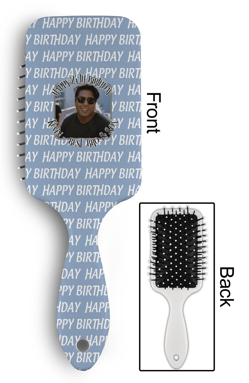 Your designed is printed on the front of the brush.; The back handle and sides are white.