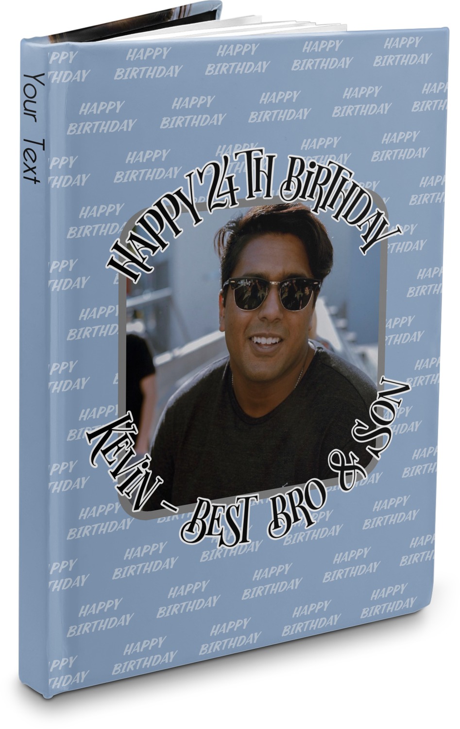 This design has a subtle background that says "Happy Birthday". You are able to upload your own picture of the birthday boy or girl right onto your design. The personalized text goes above and below your picture. This is a great design for pictures of you and the birthday boy/girl, so they can look at that cherished memory every day.