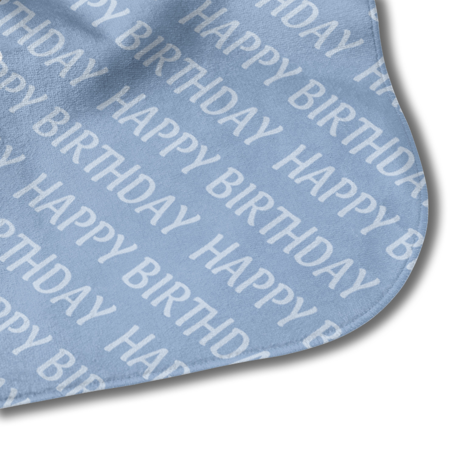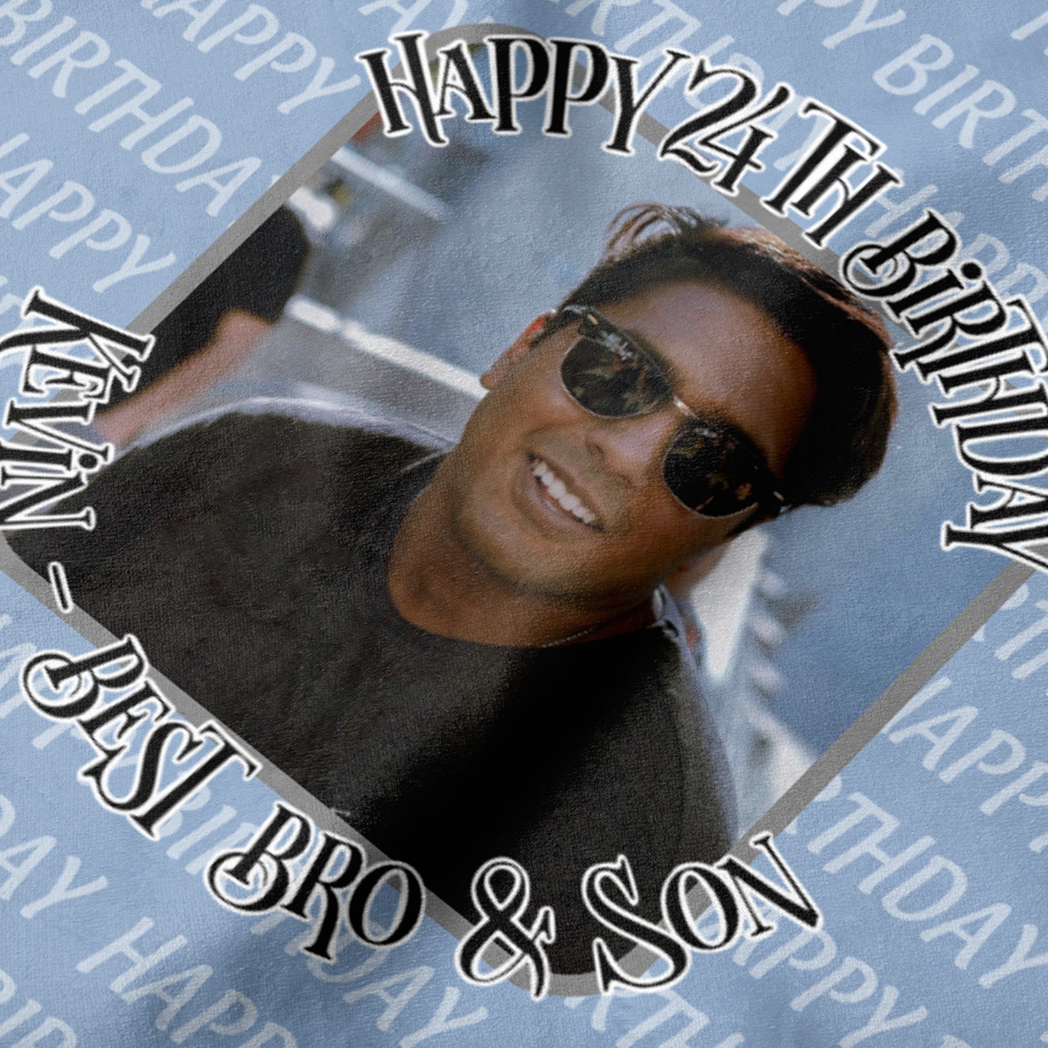 This design has a subtle background that says "Happy Birthday". You are able to upload your own picture of the birthday boy or girl right onto your design. The personalized text goes above and below your picture. This is a great design for pictures of you and the birthday boy/girl, so they can look at that cherished memory every day.