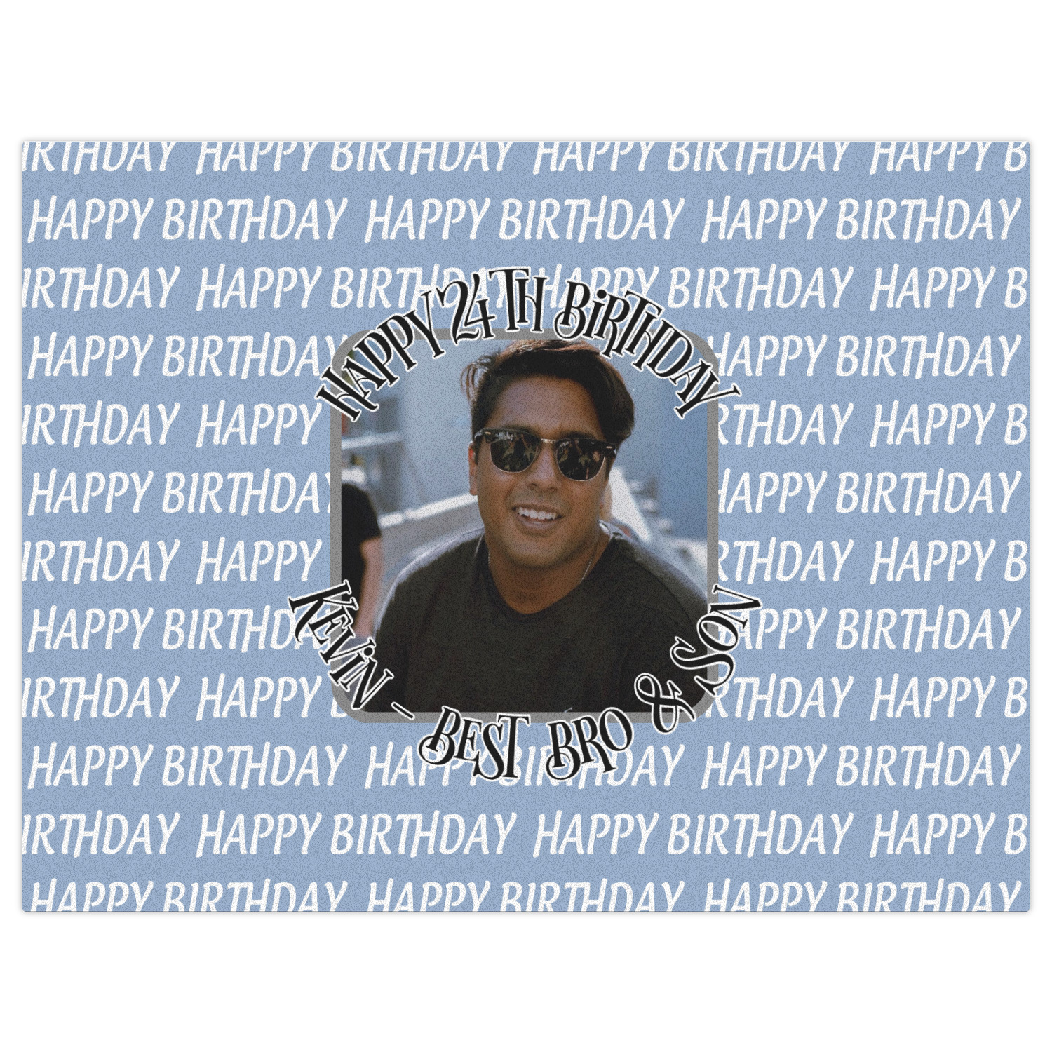 This design has a subtle background that says "Happy Birthday". You are able to upload your own picture of the birthday boy or girl right onto your design. The personalized text goes above and below your picture. This is a great design for pictures of you and the birthday boy/girl, so they can look at that cherished memory every day.